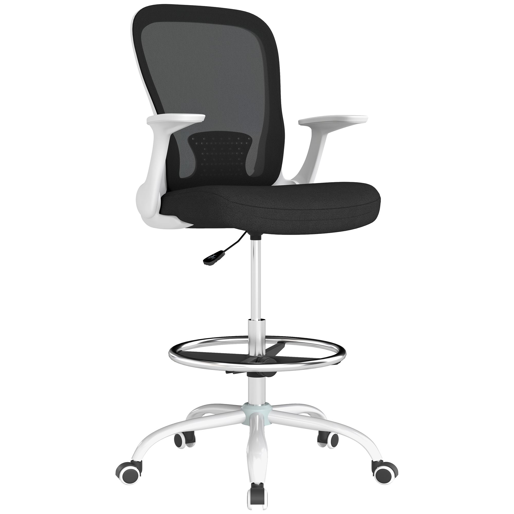 HERON Draughtsman Chair, Mesh Drafting Chair, Ergonomic Office Chair with Flip-up Armrest, Adjustable Foot Ring, Black White