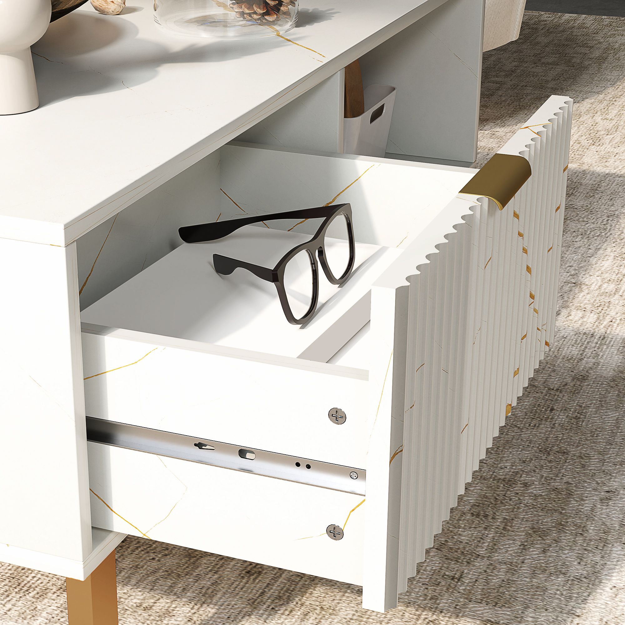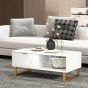 Thanks to the marble-inspired design of this HERON living room coffee table, paired with the gold tone accents, this is an elegant piece for your living space. The modern coffee table has a drawer and large shelf, with a smaller shelf on the other side; complete with steel legs for lots of support.