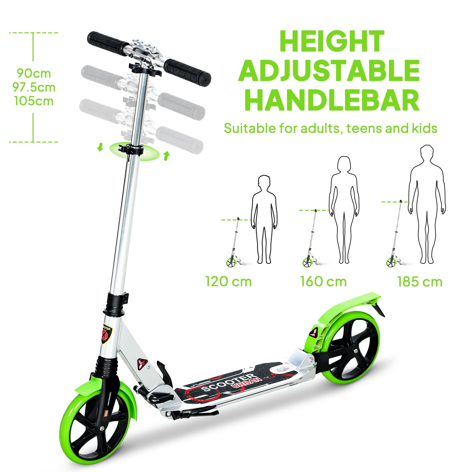 HERON Folding Kick Scooter Adjustable Ride 200mm Big Wheels Double Shock - Green