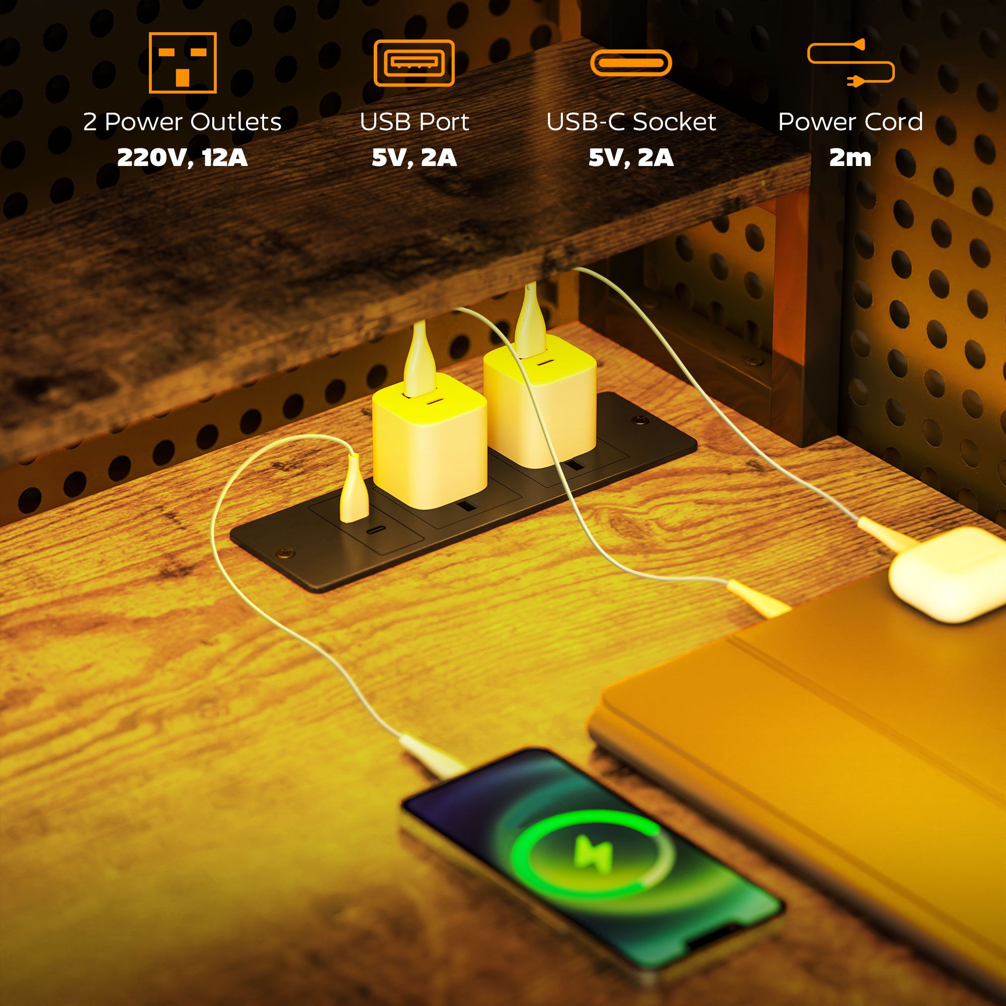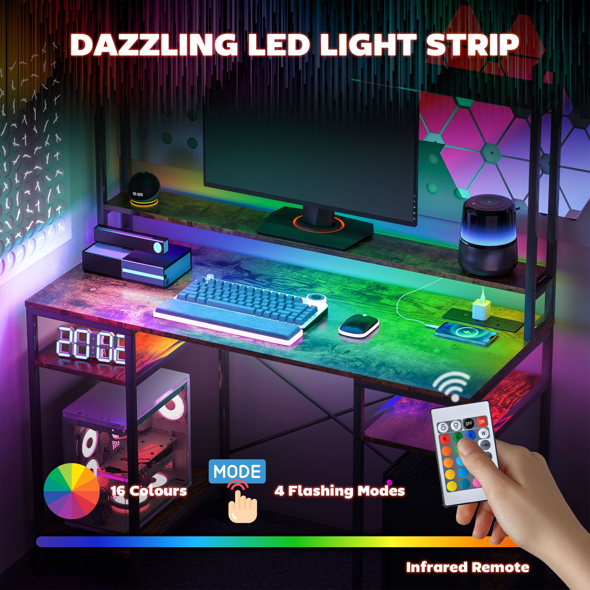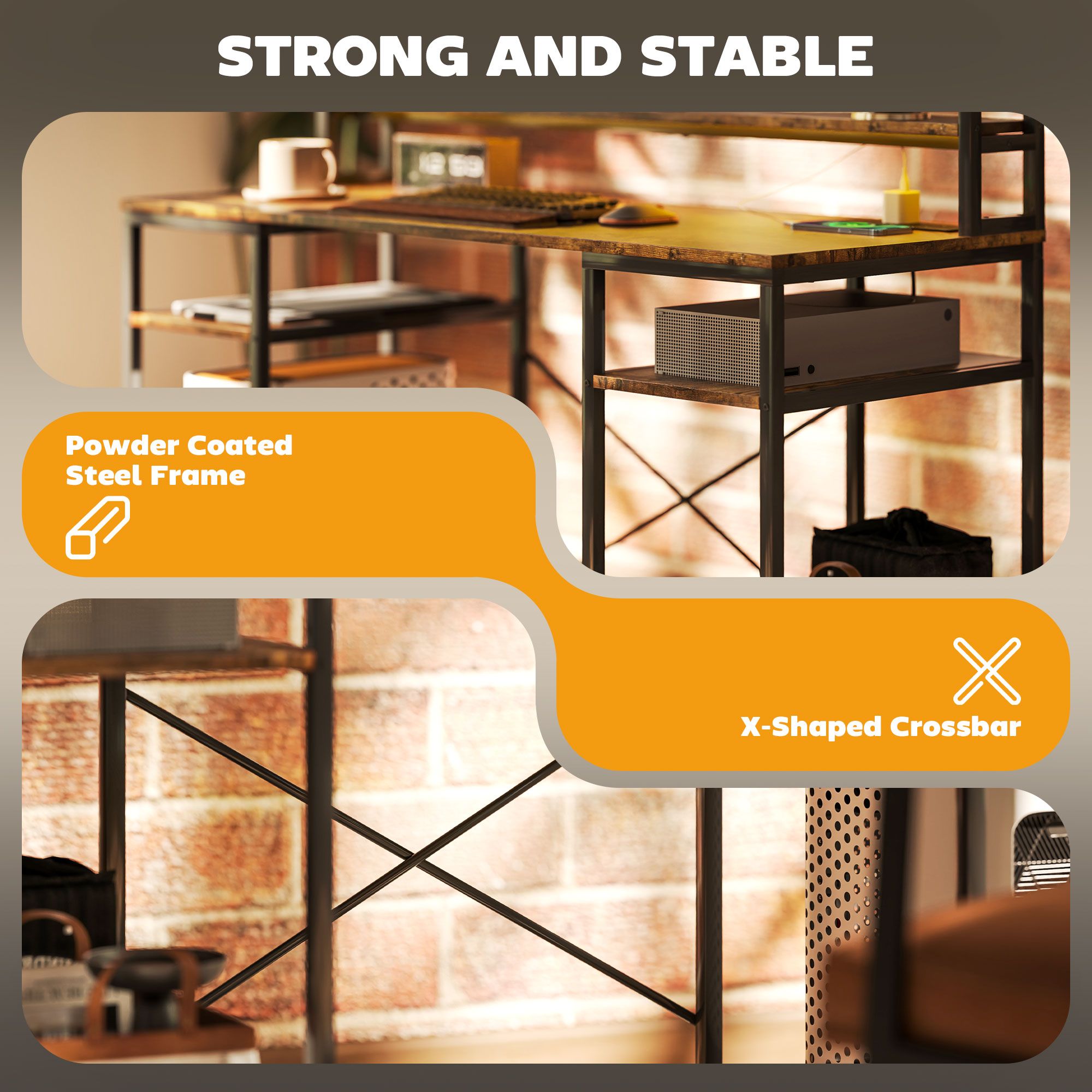 HERON LED Computer Desk, Power Outlets, Monitor Stand, 2 CPU Stands, Gaming & Office Desk, Rustic Brown