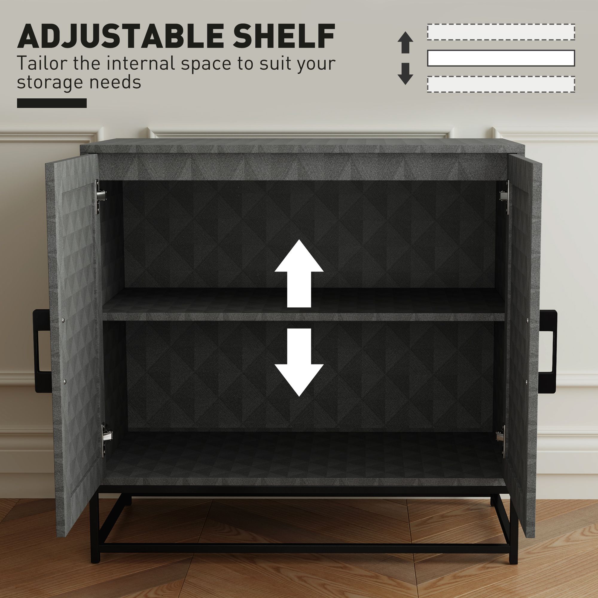 Discover the versatility of the HERON sideboard storage cabinet! With an adjustable shelf, tailor the space to fit your needs, whether in the kitchen or living room. Its robust particle board panel and steel base ensure stability, while the sleek melamine finish offers easy maintenance for a busy lifestyle. This sideboard cabinet blends functionality with style, making it a smart addition to any home.