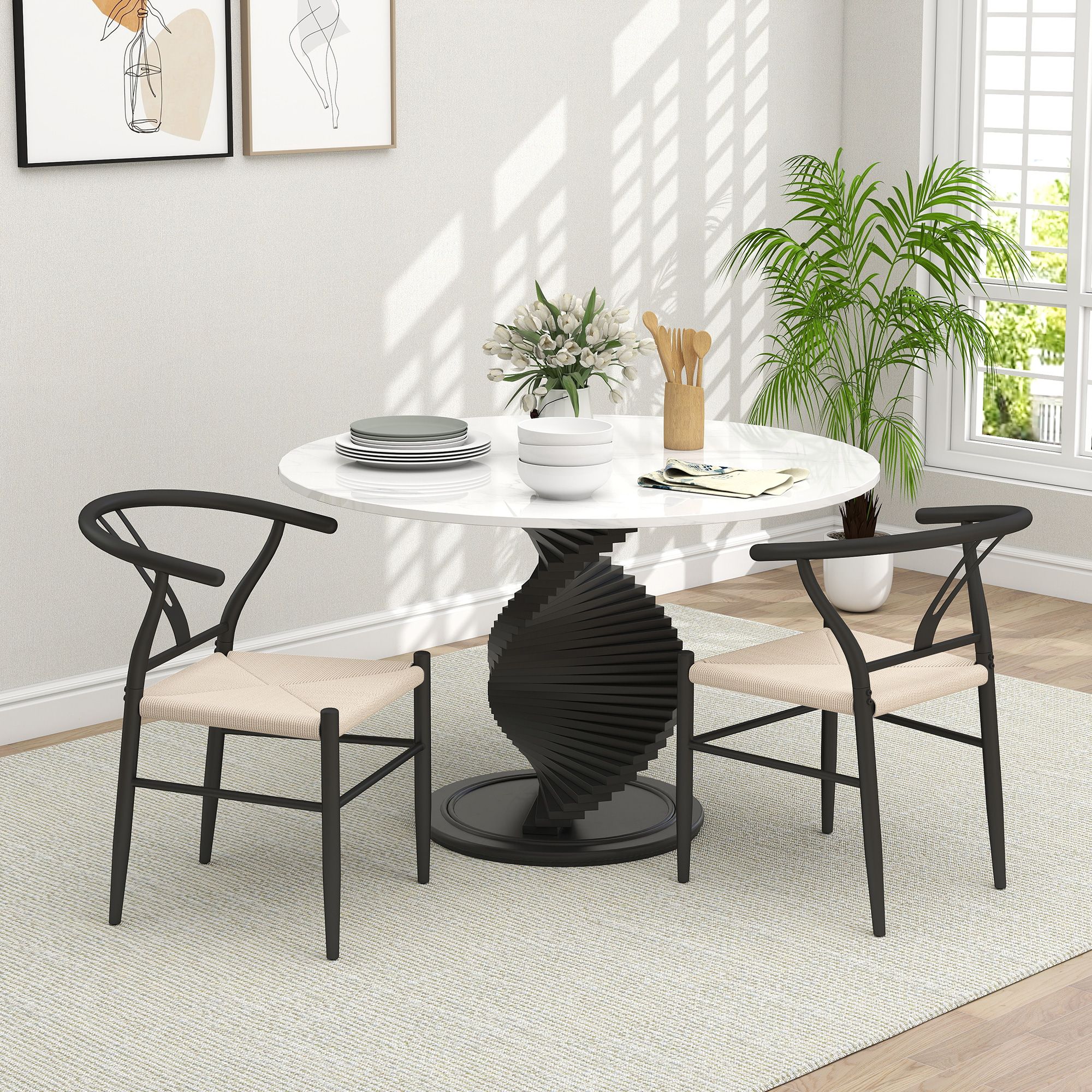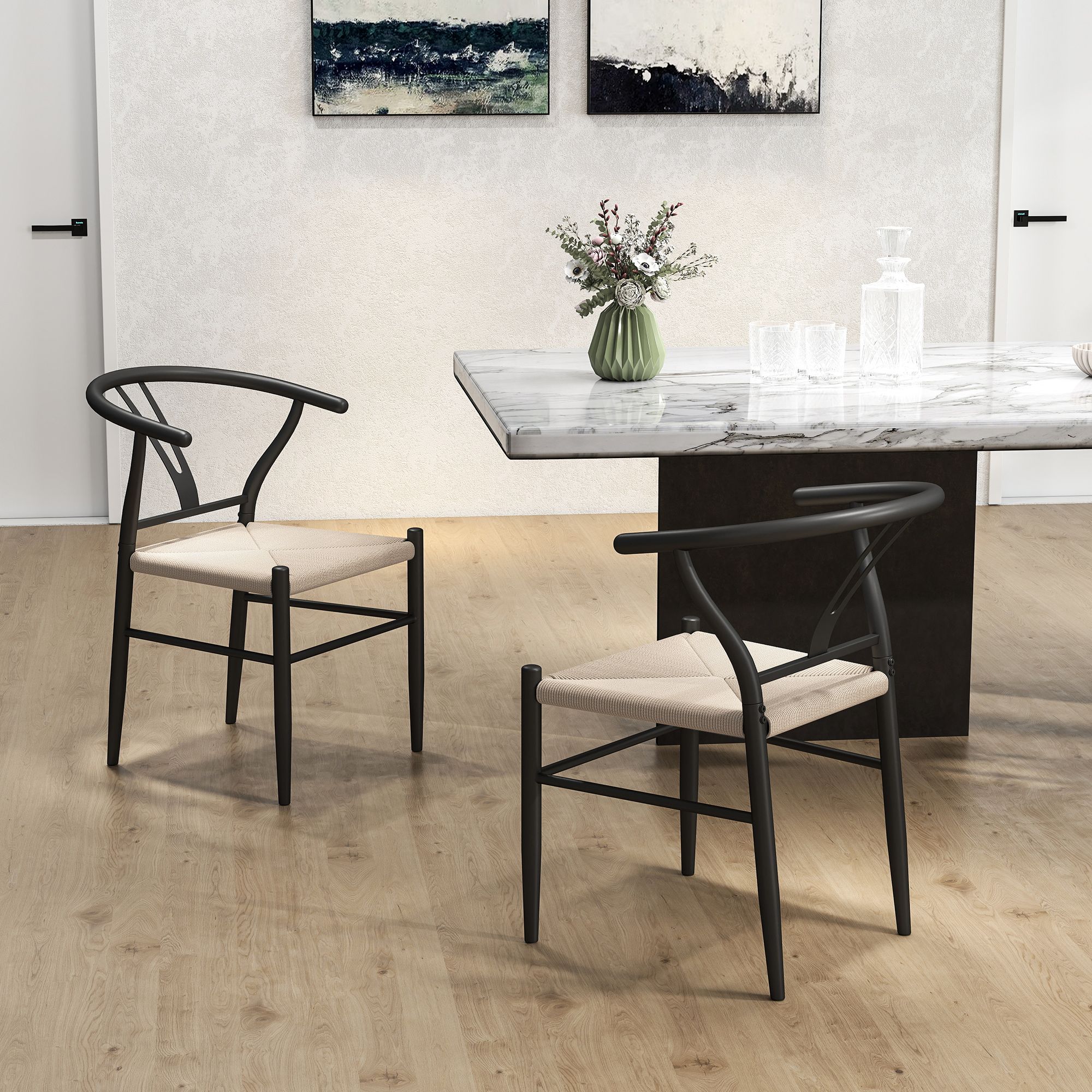 Transform your dining experience with these of two wishbone dining chairs from HERON. These kitchen chairs feature curved backrests and integrated armrests for comfort and support, coupled with a hand-woven paper rope seat for a touch of unique charm. Suitable for kitchens, dining areas, or even creative spaces, these mid-century modern dining table chairs bring a sleek and stylish presence to any room.
