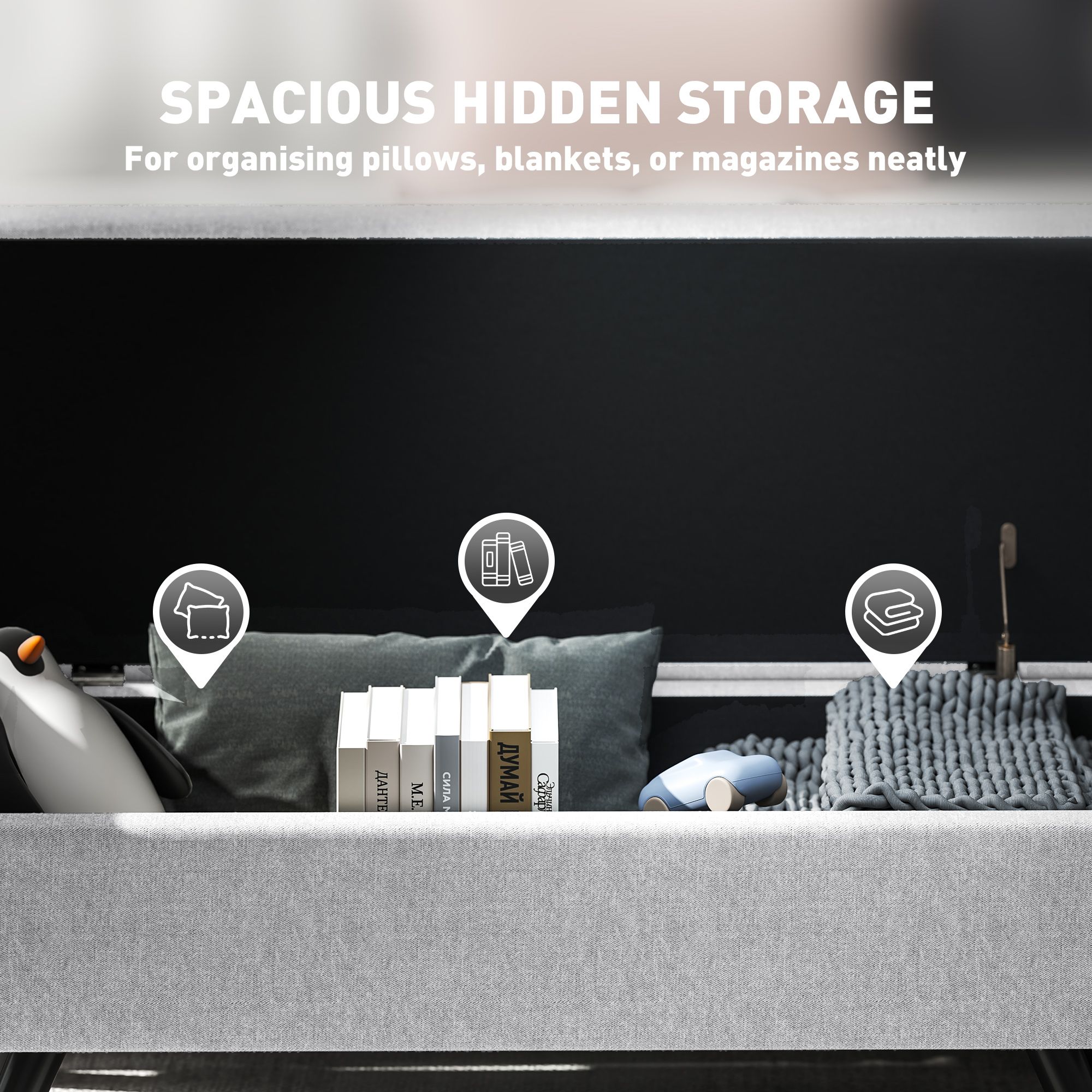HERON Storage Ottoman, Linen Upholstered Bench with Armrests, Footstool, Light Grey