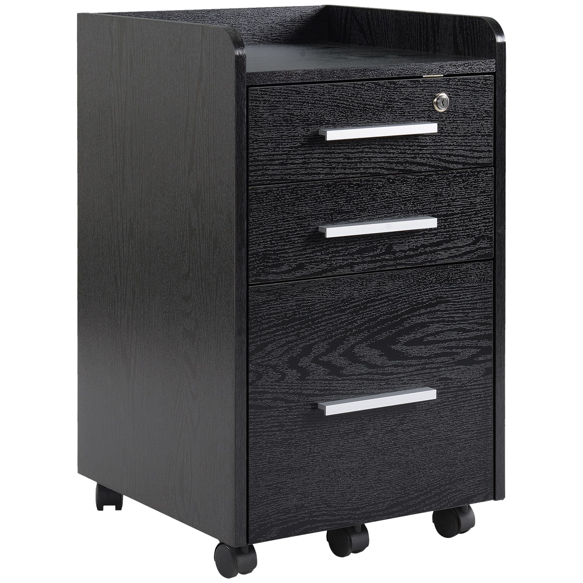 Keep workspace files tidy and secure with this HERON wood-effect lockable filing cabinet. It has three drawers to hold papers, boxes, files and stationery, with a lockable top drawer for security. A compact size which slots under desks easily, it is complete with five wheels to move around easily - please two brakes for security.