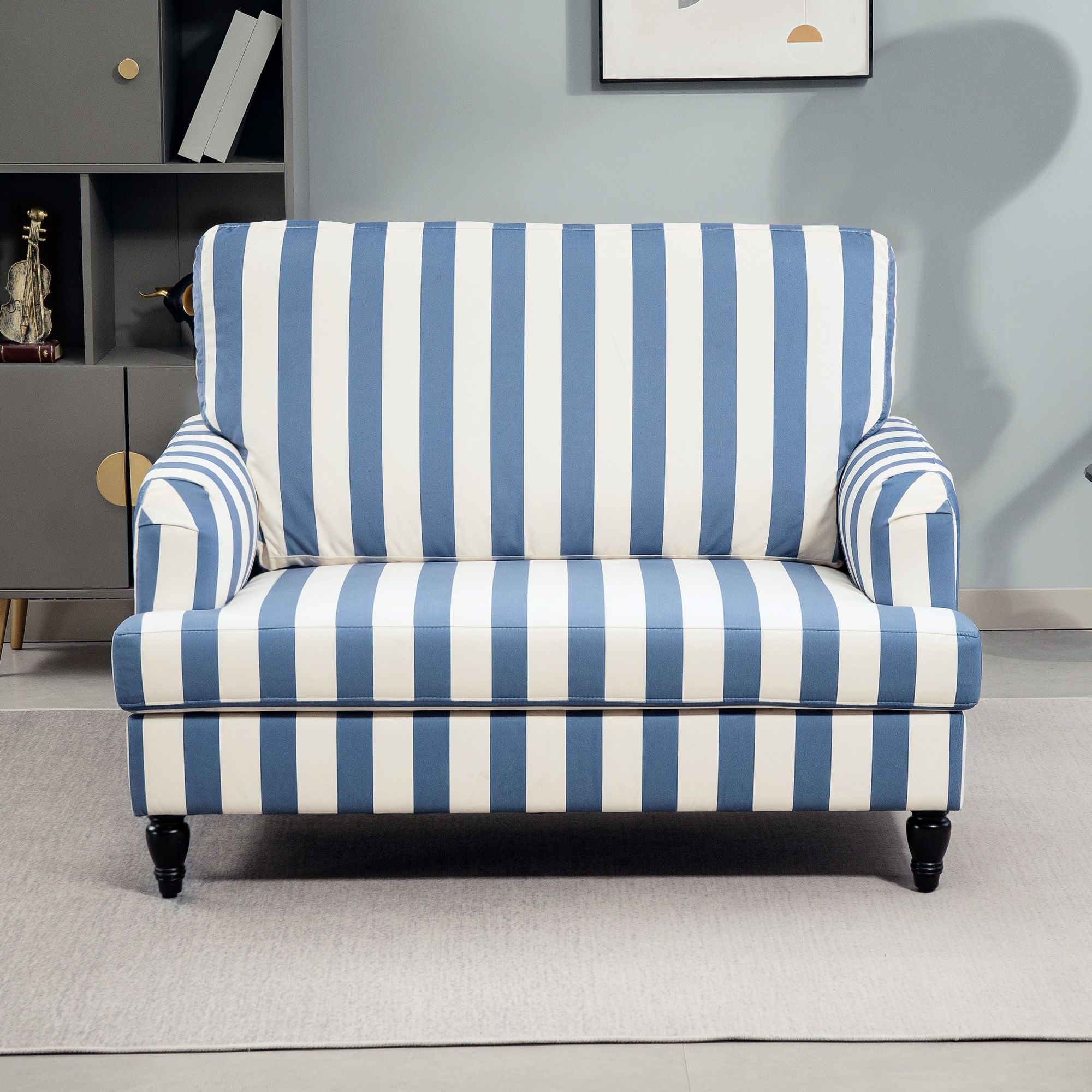 HERON Velvet Accent Chair, Striped Upholstered Armchair with Turned Legs, Blue & White