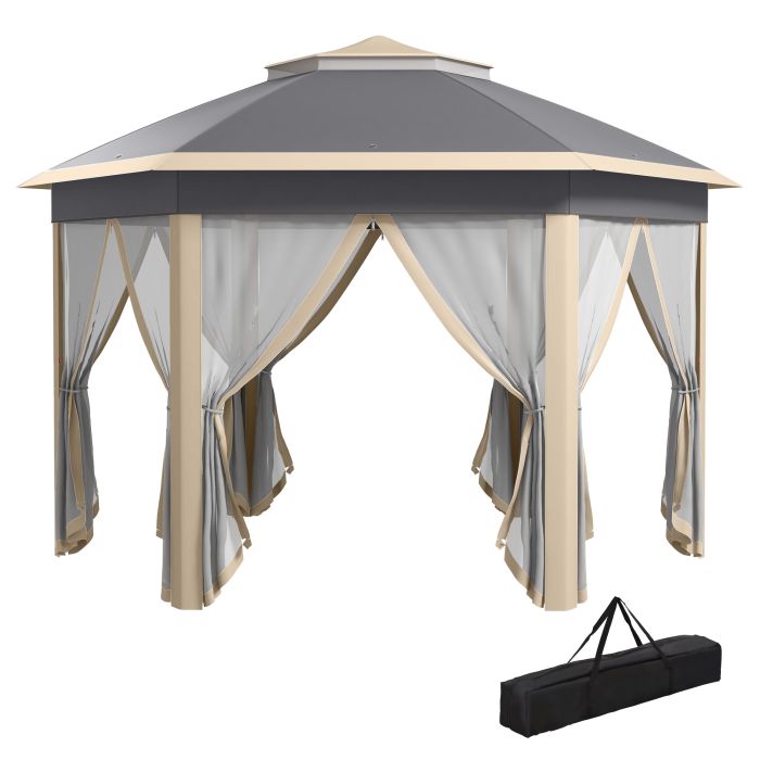 Hexagon Pop Up Gazebo Outdoor Patio Gazebo Double Roof Instant Shelter with Netting, 3 x 4m, Khaki