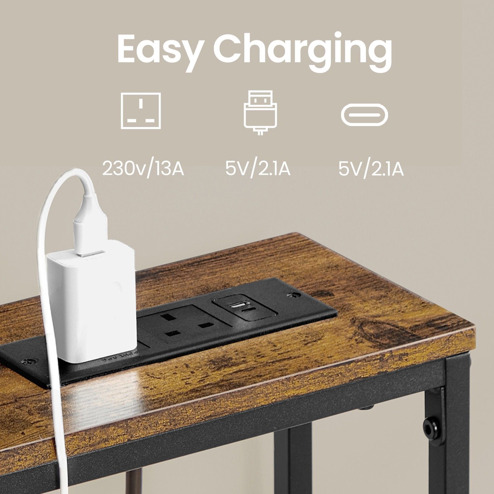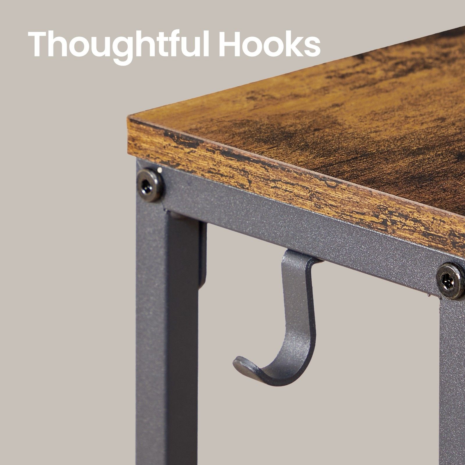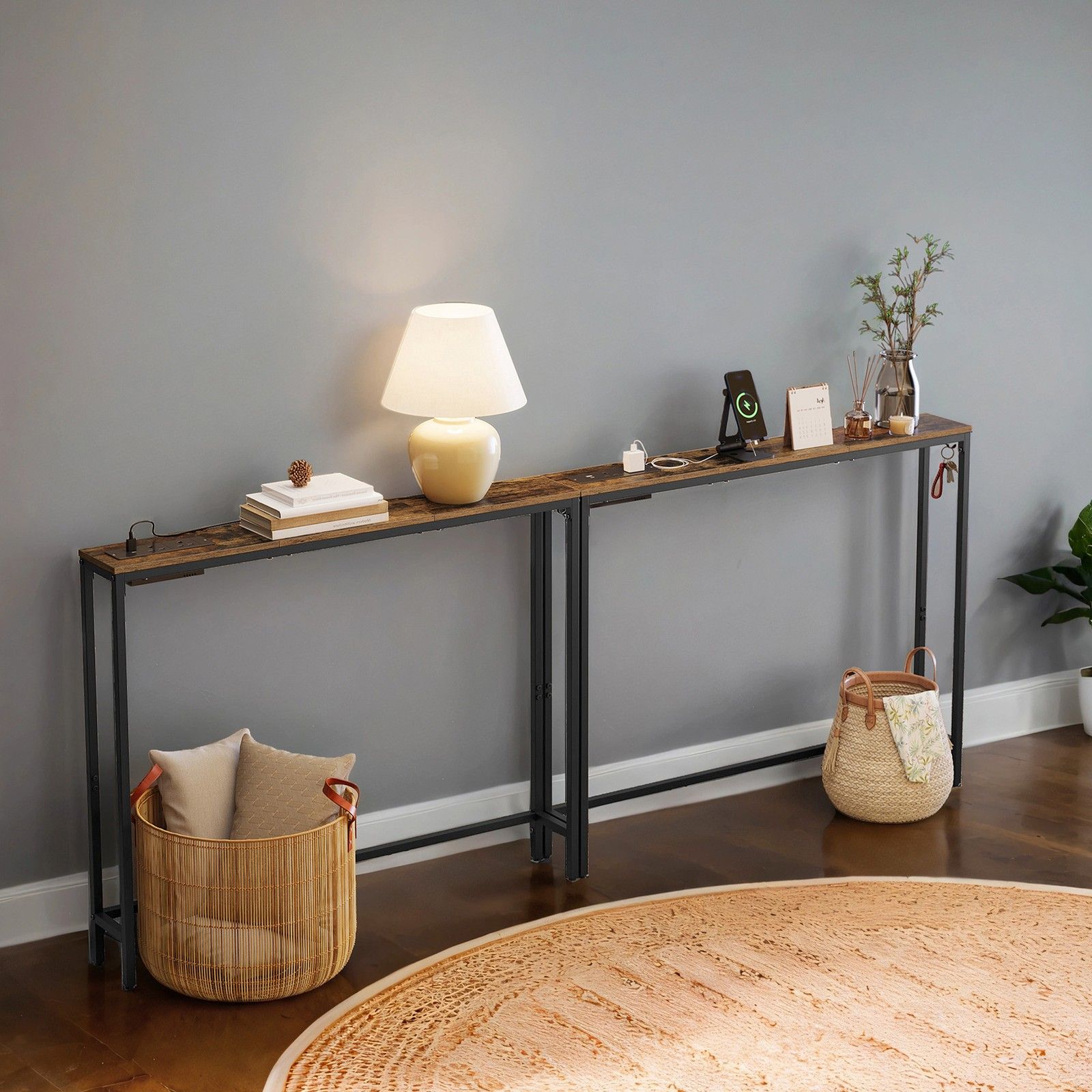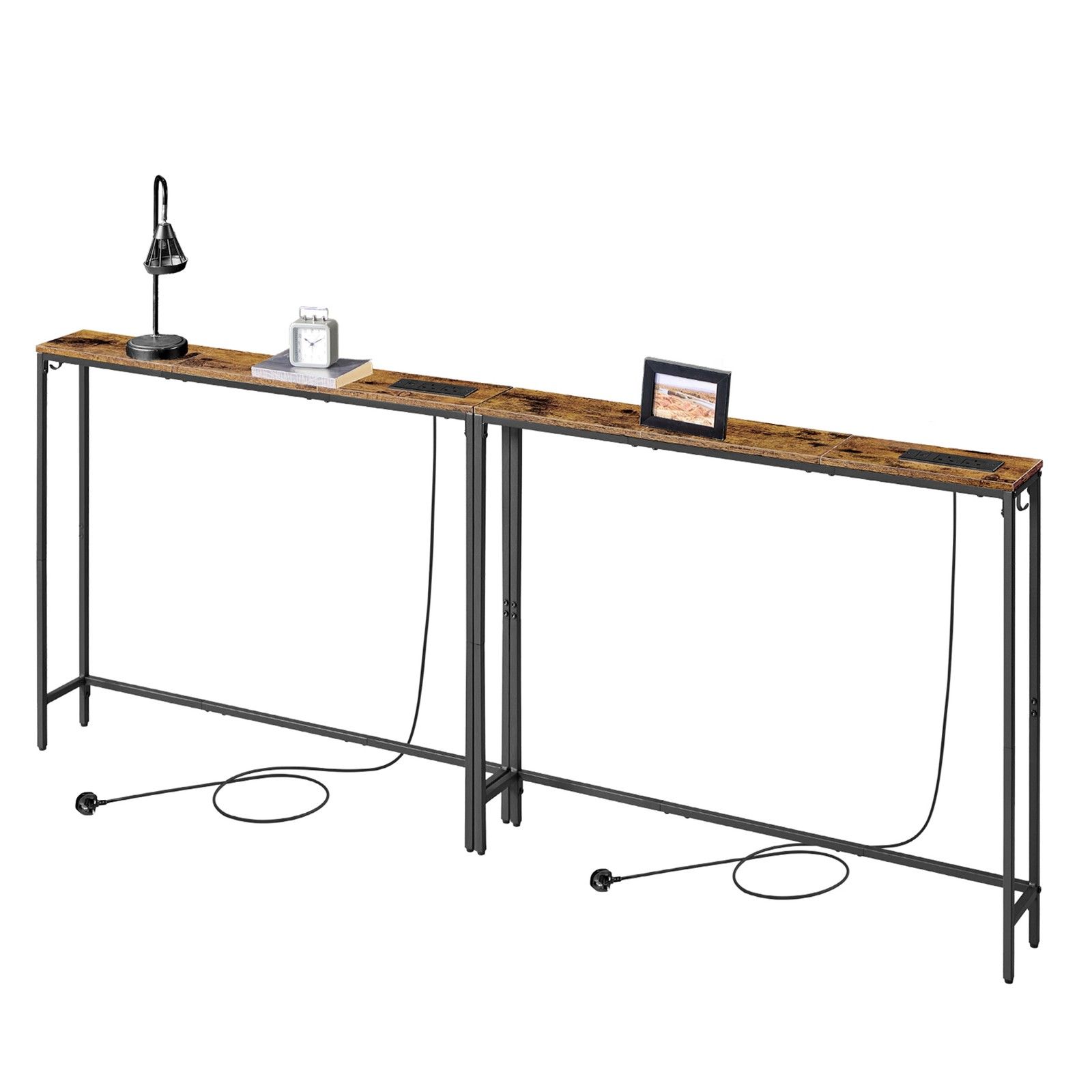 HOLLENSHIRE Slim Console Tables with Built-In Charging Station and Hooks Set of 2 - Black and Brown