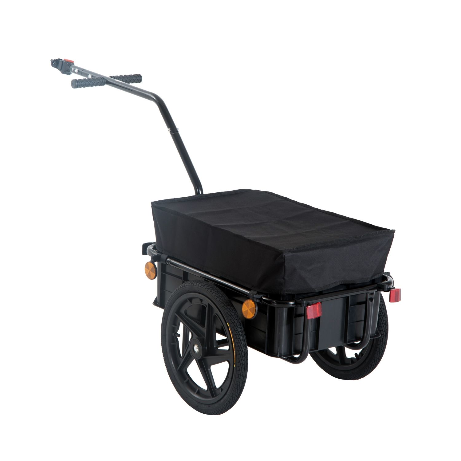 This Aosom branded bicycle trailer is a great way to move items around using a bicycle. The trailer is made of a steel construction with a removable storage box and a fabric cover. The trailer has 2 inflatable wheels which makes it more stable and sturdy when moving. This is a great way to transporting goods and comes complete with reflectors for safety.
