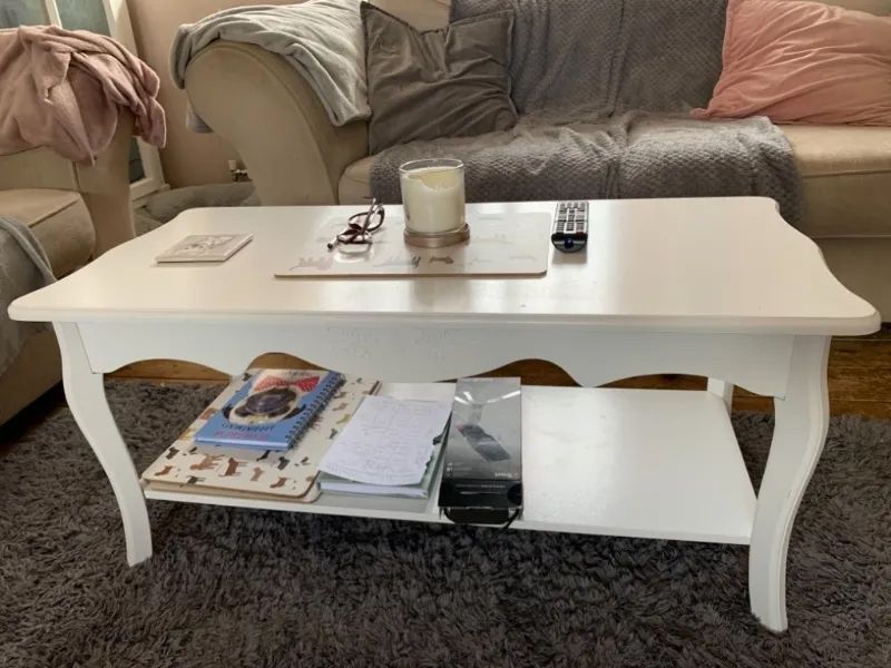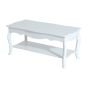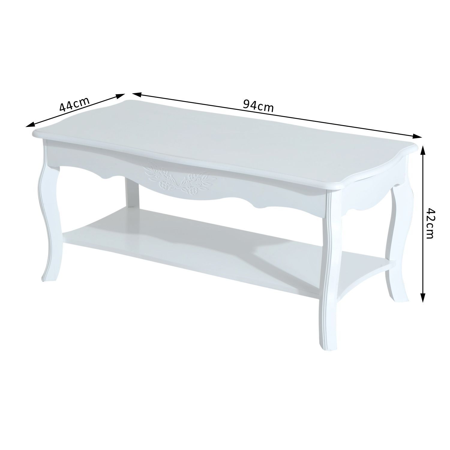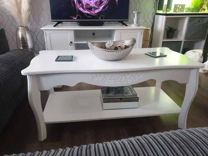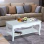 This Coffee table in white will be a great addition to your living space. Designed with a bottom shelf for extra storage for books and magazines. The contemproray styling offers a rectagular shape with curved legs, with the ability to be moved easily with its lightweight construction. It is easy to keep clean with low maintenance, and will match room decor.
