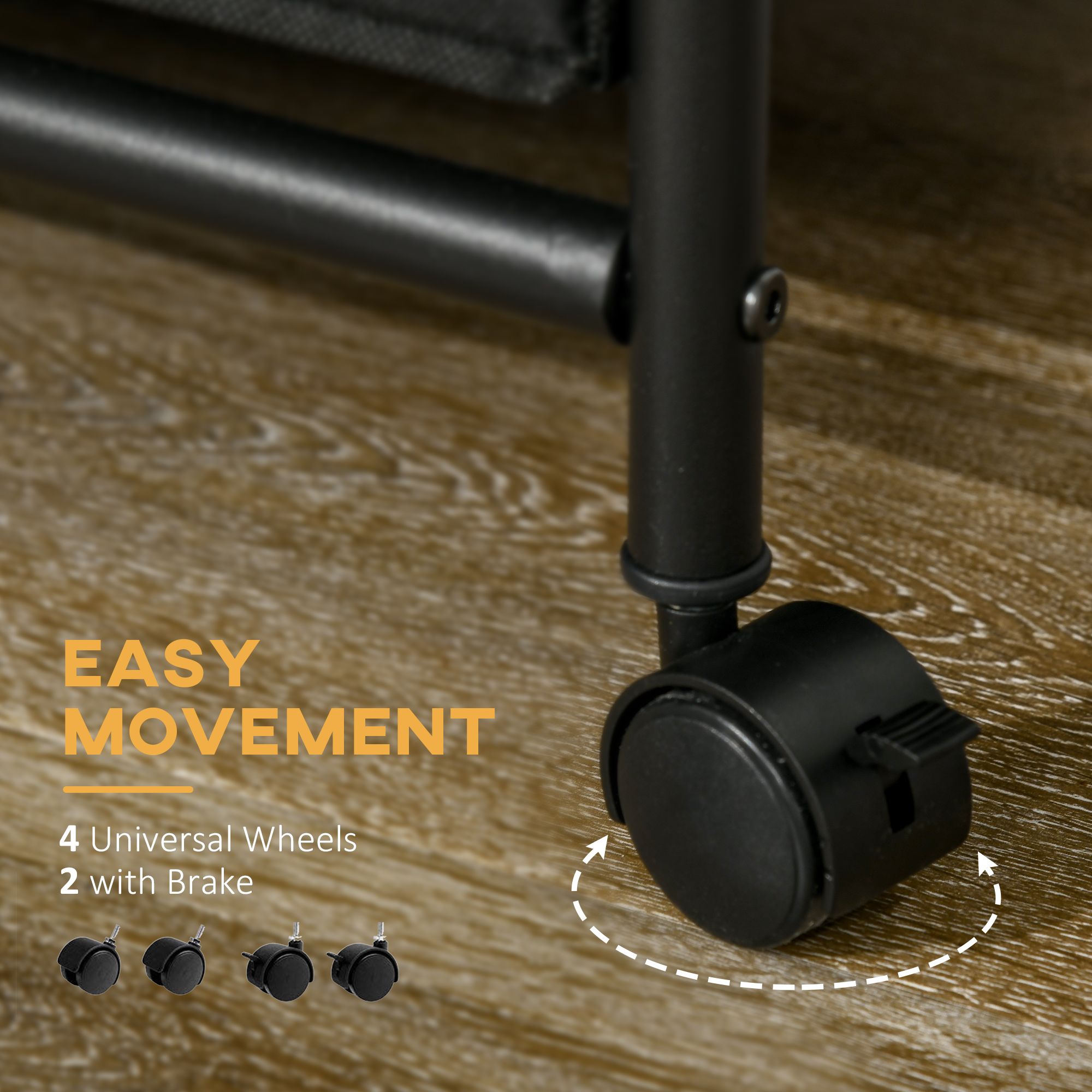 - Easy Movement: Equipped with 4 universal casters for effortless movement. 2 of the casters are equipped with brakes to keep the rack in place.