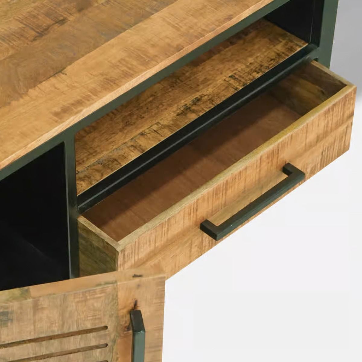 The Mango Small TV Unit 118cm is a stunning piece of Industrial Furniture that will make a statement in any room. The solid Rough Sawn Wood Finish is beautifully finished and the black metal frame gives it a unique look. There’s plenty of storage space with one drawer and one door, and the black handles add a touch of luxury. But what makes this Industrial TV Unit really stand out is the three slot cut on the doors, which give it an edgy, contemporary feel.