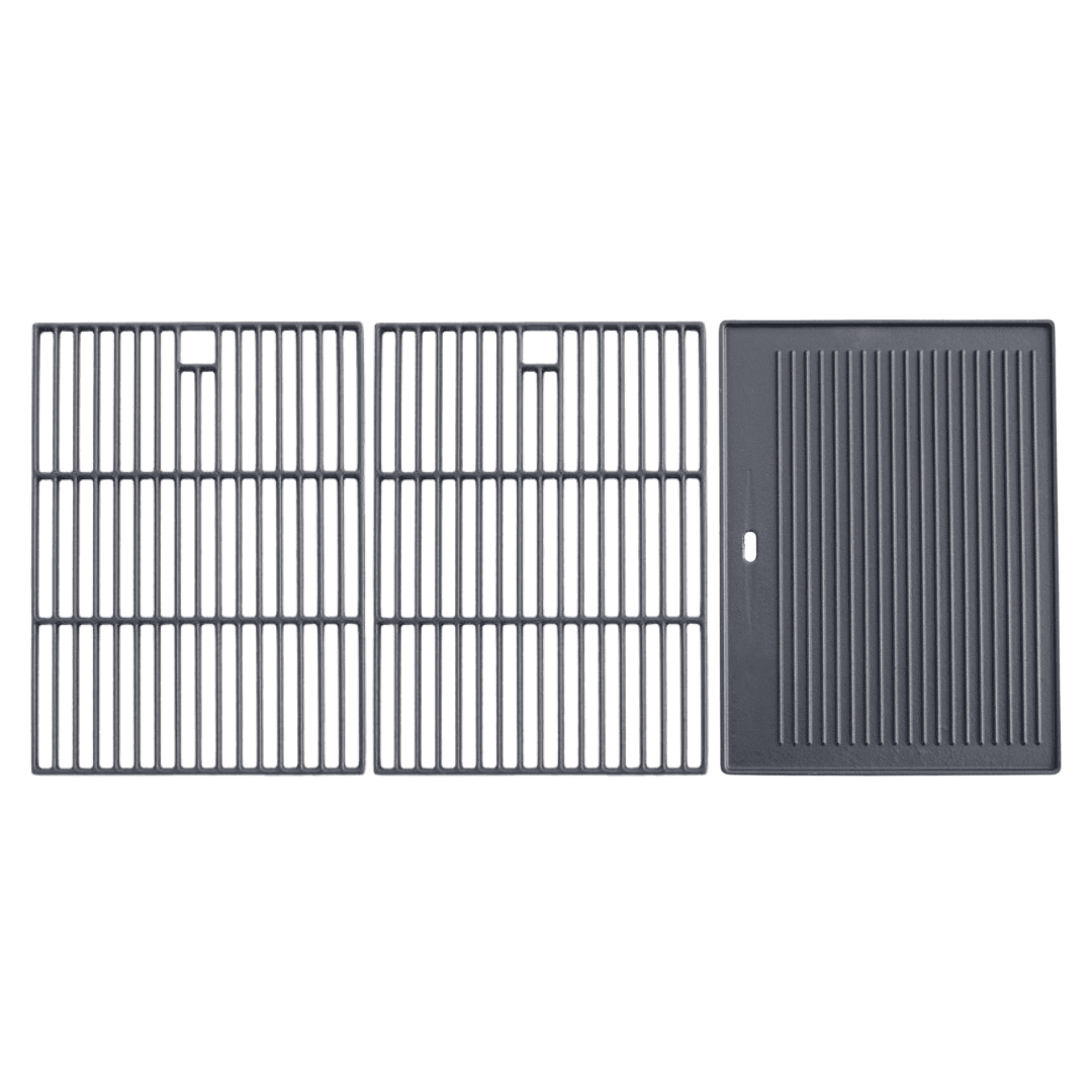 - This set includes one cast iron griddle plate and two cast iron grill grates