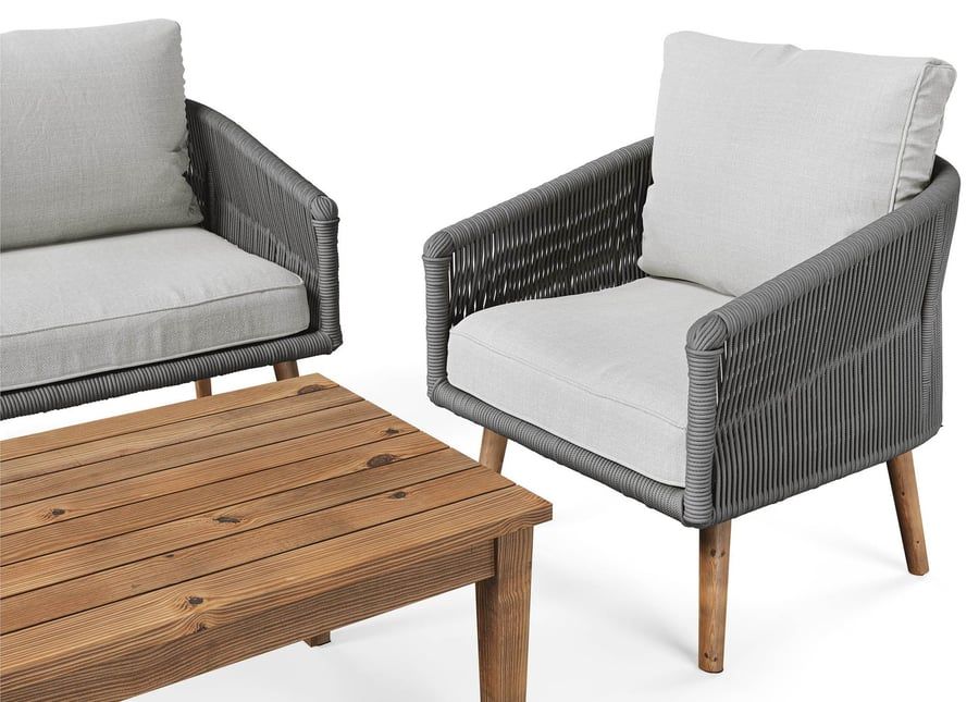 The IRWORTH garden furniture set by Dako is the perfect solution for people who want to create a place in their garden to relax outdoors and spend time with their loved ones. The elegant, four-person set, which includes a two-seater sofa, two armchairs and a coffee table, will work perfectly as equipment for a terrace or garden. IRWORTH garden furniture is distinguished by its precise workmanship and durability of the materials used. The armchairs and sofa are hand-woven from thick, durable string, while the legs and table are made of oiled acacia wood. Thanks to the use of a powder-coated aluminium frame, the construction of the furniture is resistant to weather conditions, but also lightweight, which allows you to easily move and carry the furniture. Thick cushions on the seats and backrests provide comfort and convenience of use.