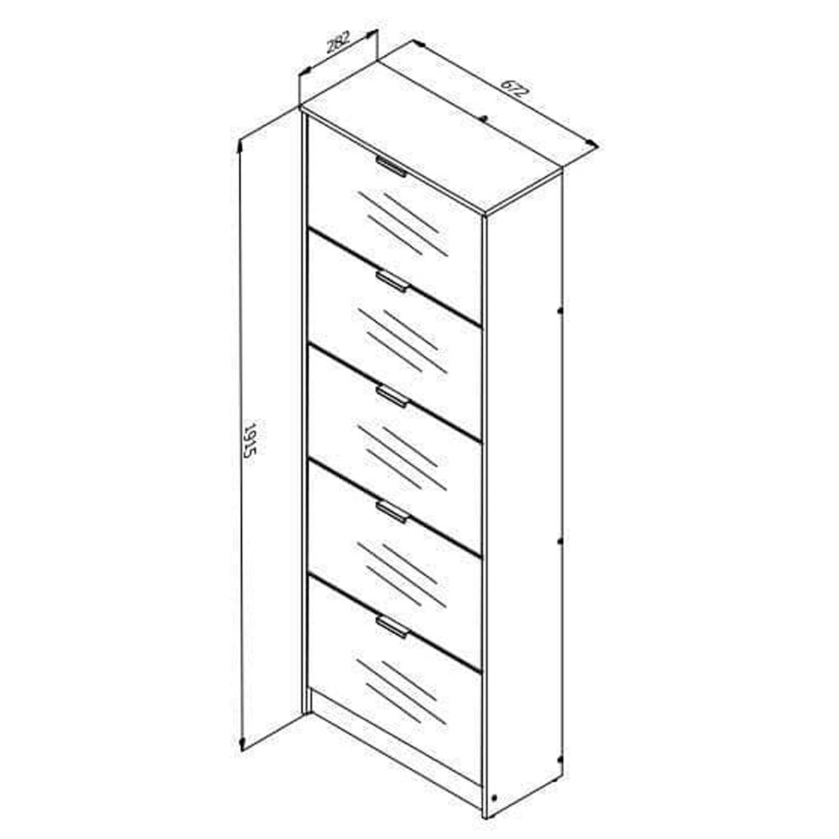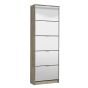 The modern James shoe cabinet with a full mirrored front and oak effect sides and top. This shoe storage unit features 5 revolving drawers providing ample storage.