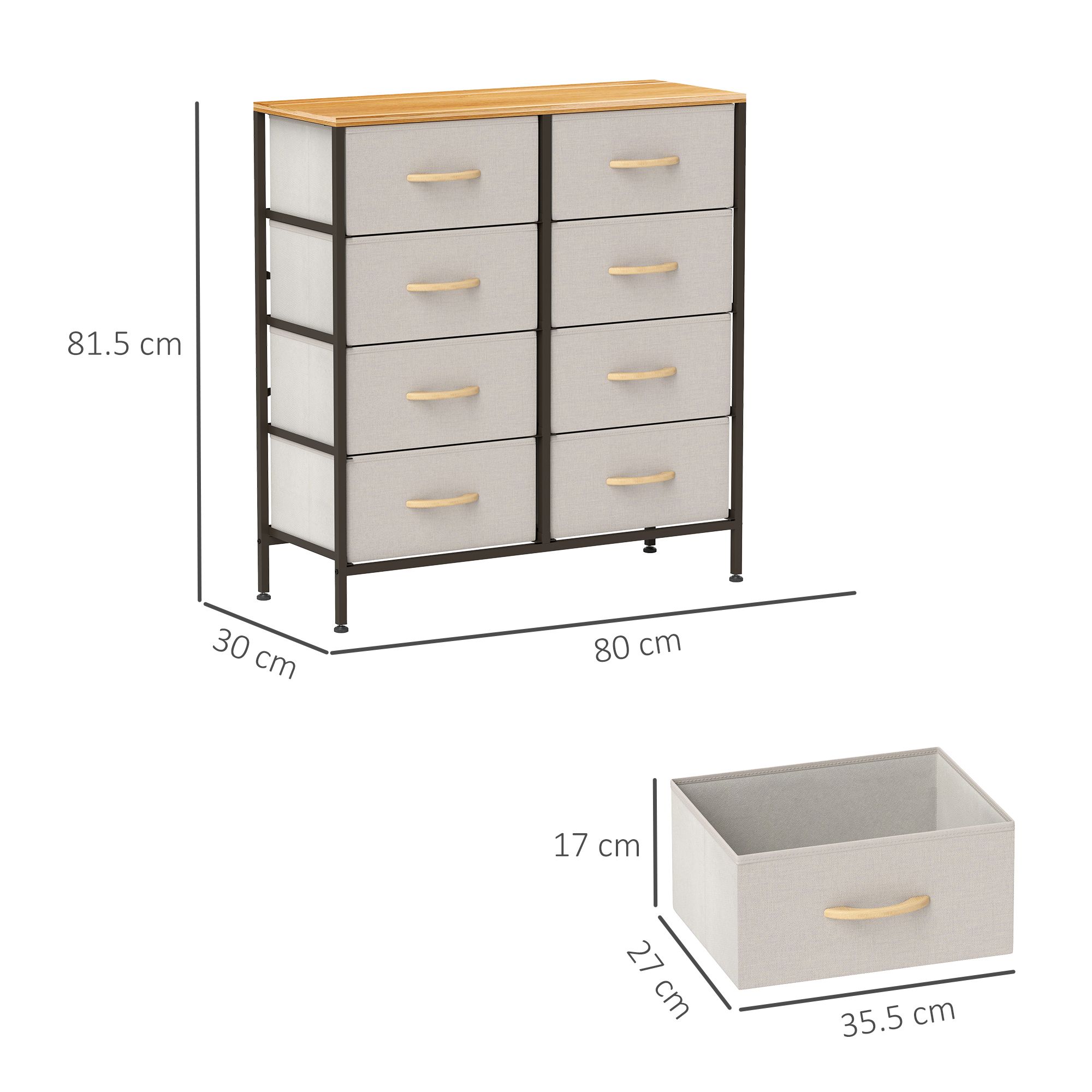 JAPRIS Grey Chest of Drawers - Medium-sized, 8 Drawers, Double, Fabric Drawers - Black Frame Medium Oak Top