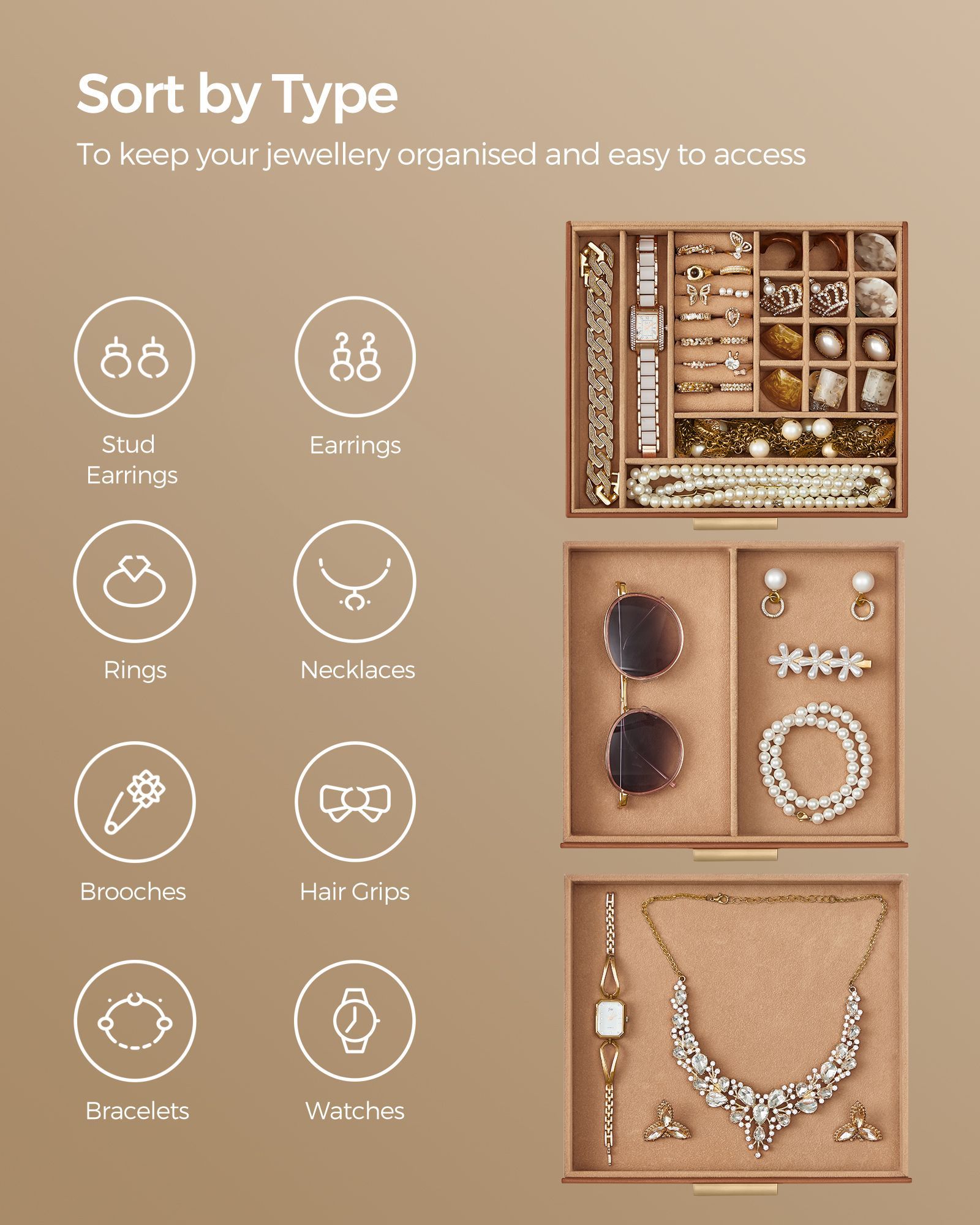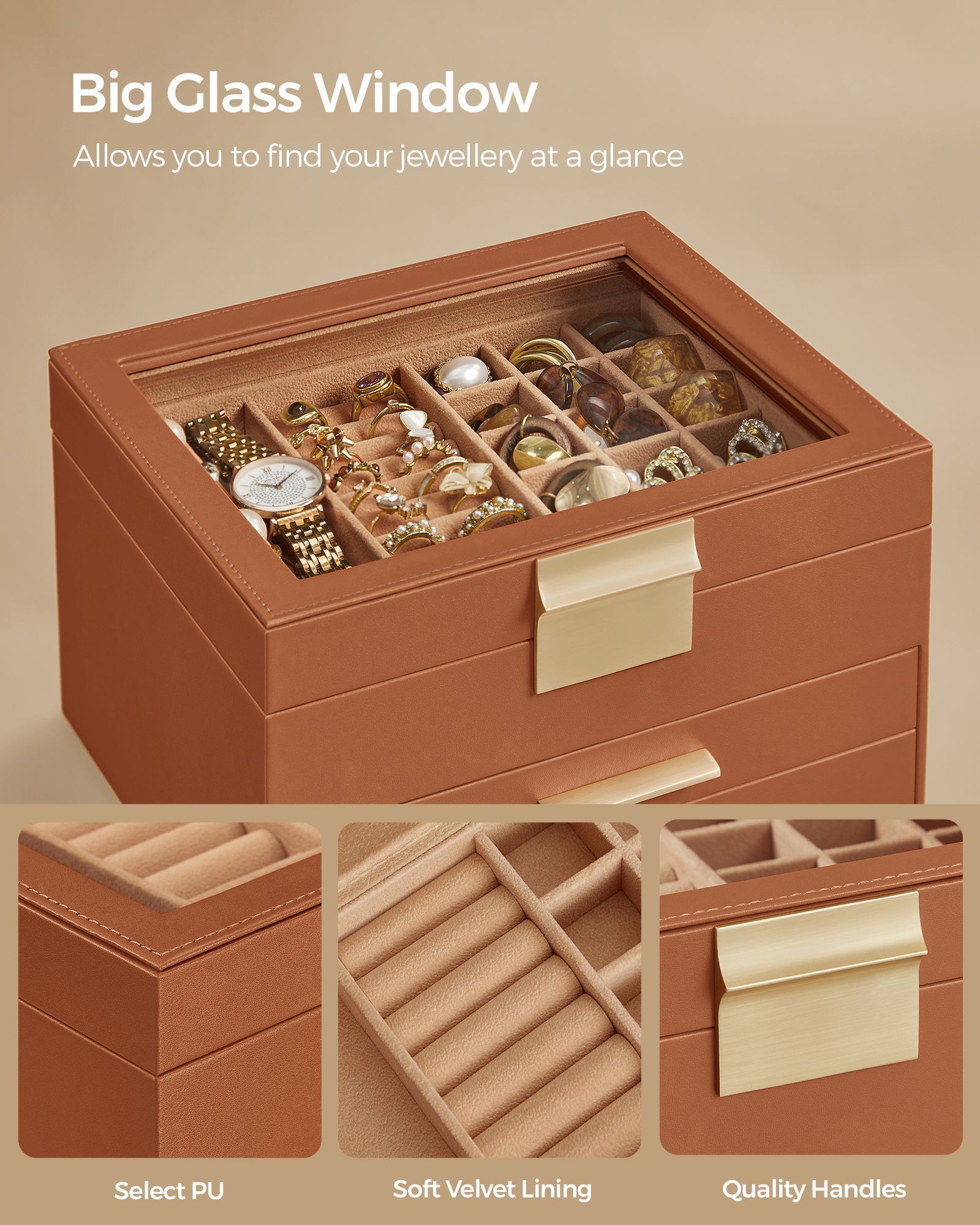 Jewellery Box - SOLNZA 3 Tier Organizer with Lid - Caramel Brown and Gold