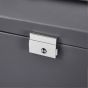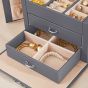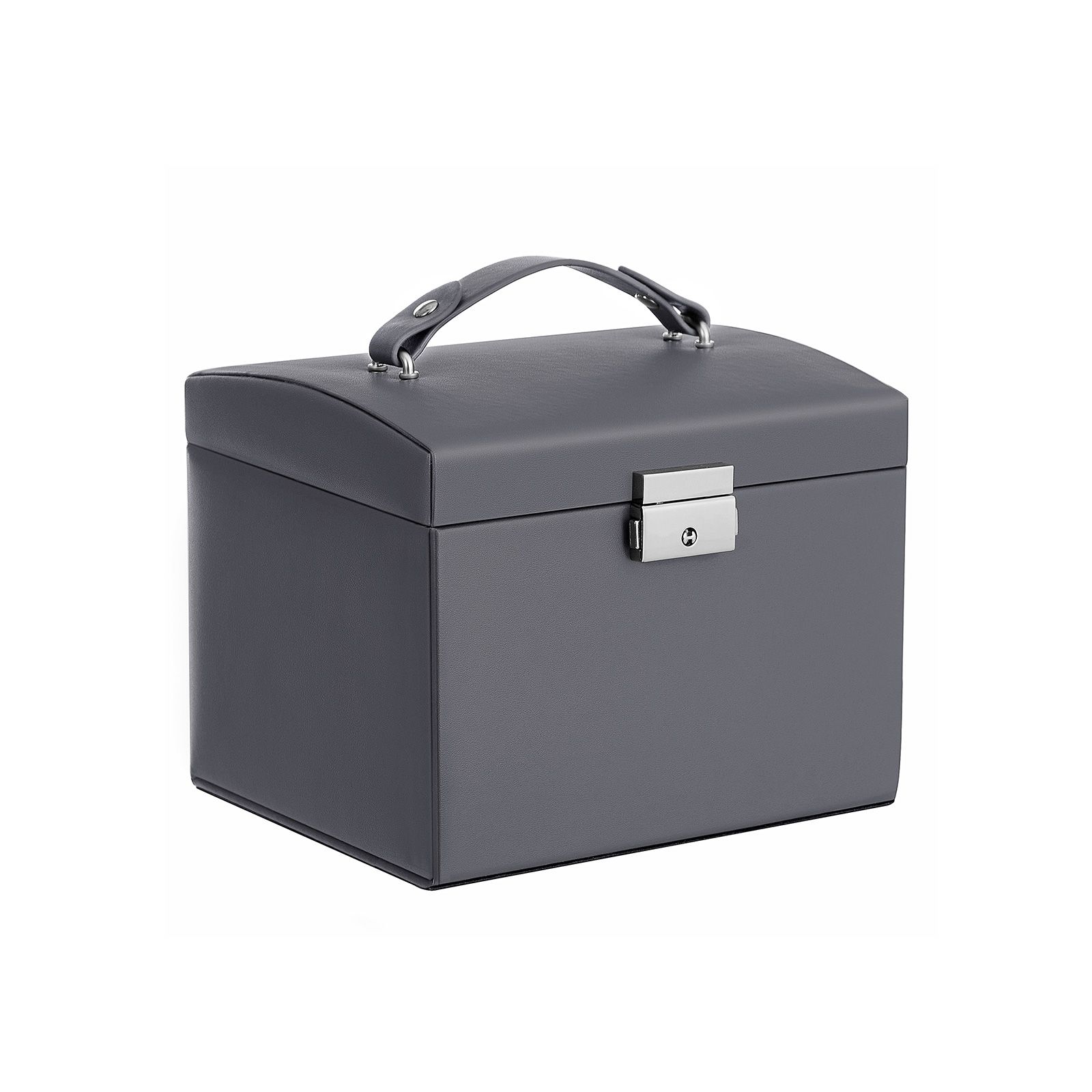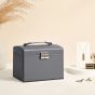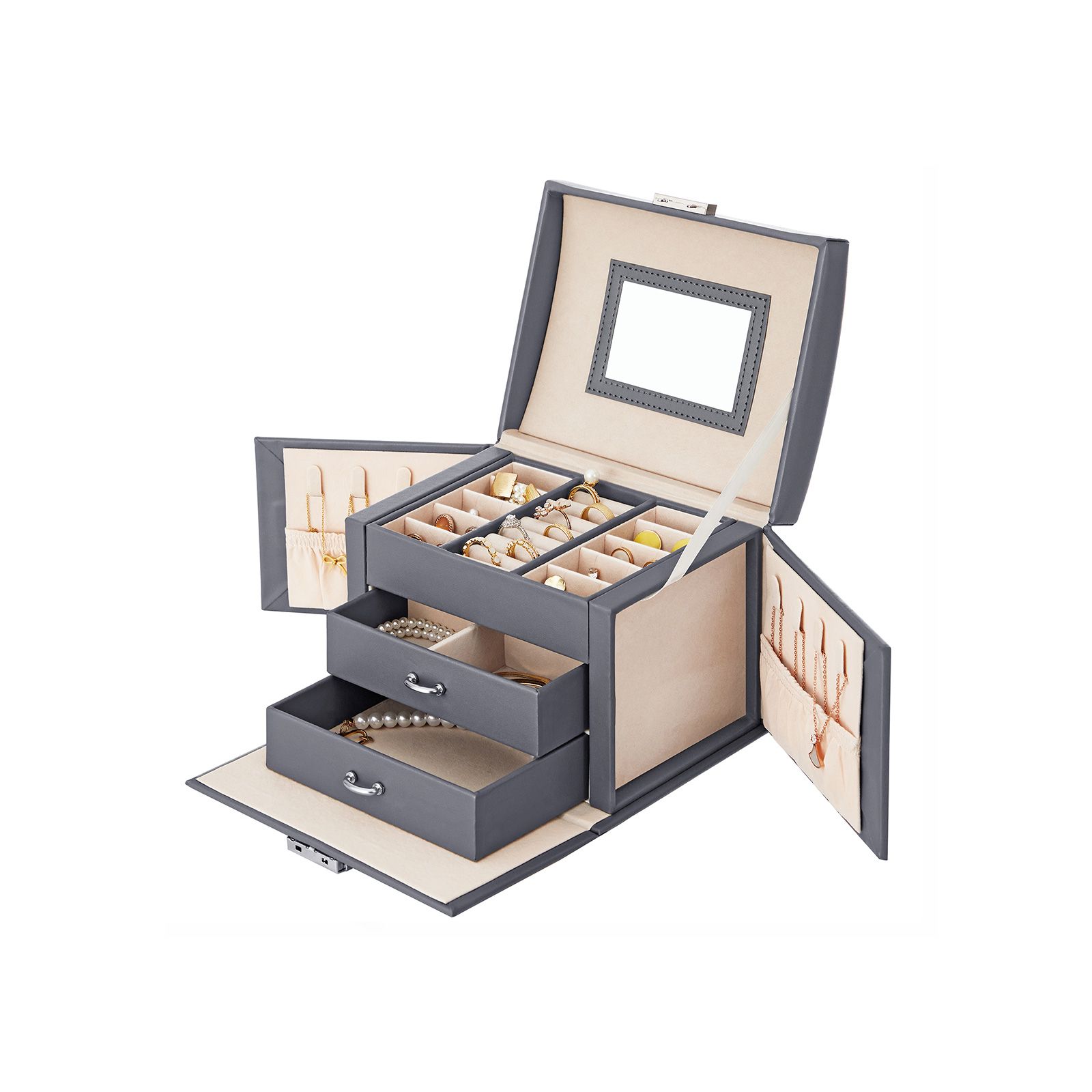 An instant favourite: The simple lines, compact size and soft faux leather cover - all this makes this jewellery box a stylish addition to your dresser - and a perfect home for your shiny jewellery.For travel? Just right: Whether for a daily event or for a longer trip... The many storage spaces in this jewellery box allow your most important treasures to travel with you - simply decide which earrings and necklace you put on depending on the situation Even better: Thanks to the lockable design with 2 keys, everything is safe while you enjoy the journey.Product details:Colour: GreyMaterial: MDF (medium density fibreboard), PU (polyurethane), velvetSize: 17.5 x 13.5 x 12 cm (L x W x H).