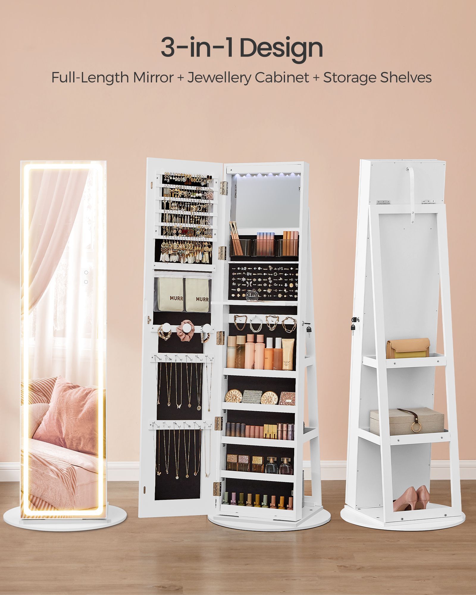 This elegant Cloud White Jewellery Cabinet offers a stylish and organized solution for your accessories. Featuring a full-length mirror with adjustable LED lights, it illuminates your jewellery collection for easy selection. The lockable design ensures security, while its space-saving standing format makes it a perfect addition to any room. An ideal gift for any jewellery lover.
