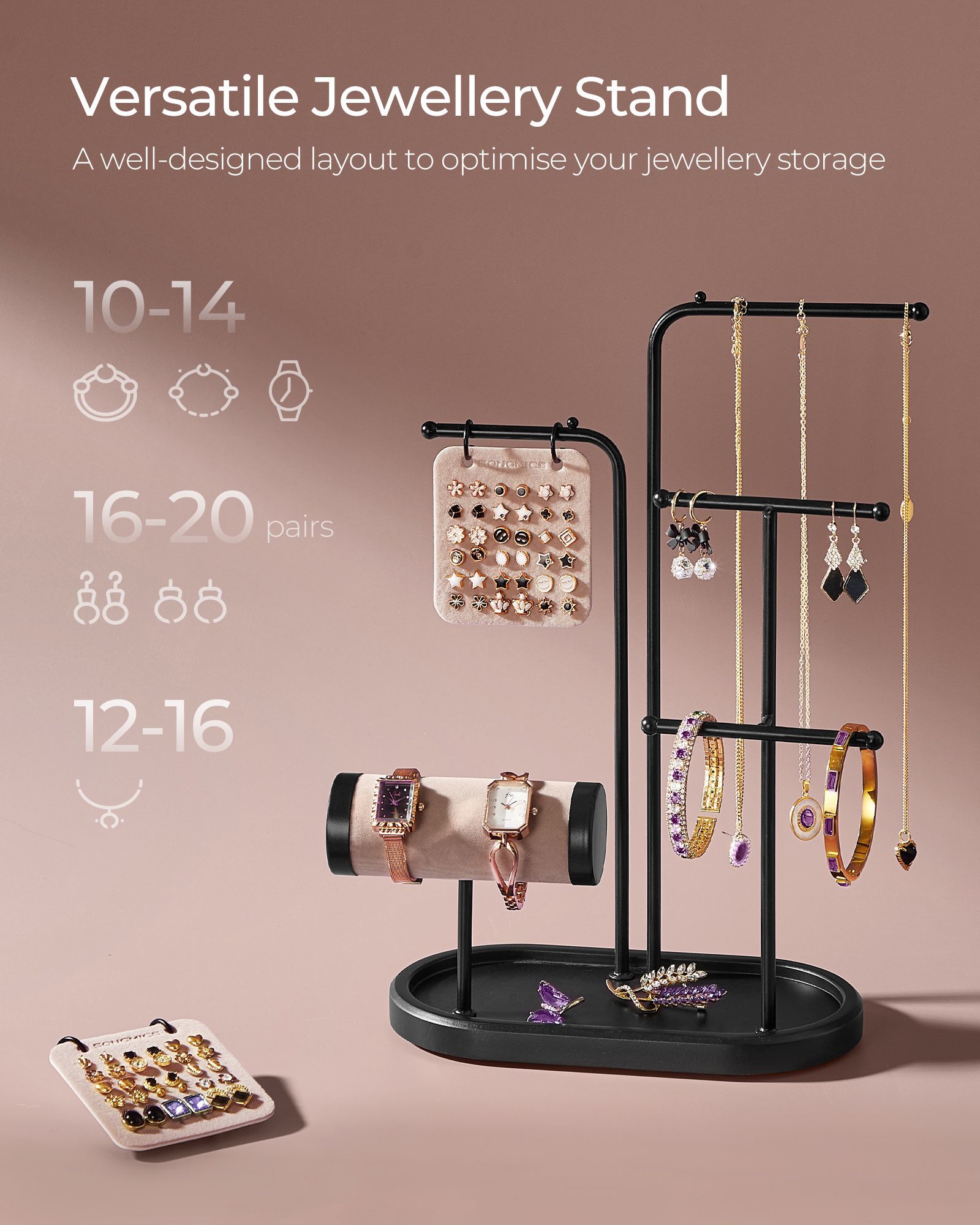 This elegant Ink Black Jewellery Stand is the perfect organiser for your treasured accessories. Featuring a sturdy metal frame, it boasts two earring boards and four hanging rods, providing ample space to display and store necklaces, earrings, and bracelets. Keep your watches and other small items neatly organised with this stylish and functional display holder.