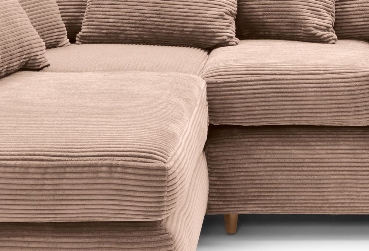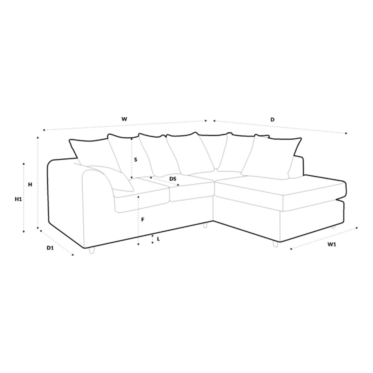 Enjoy a lavish chaise corner sofa upholstered in the most pristine soft structured cord chenille fabric there is. Soft to the touch. Opulent and inviting in its visual appeal. Angular arms, a pared back and generously filled scatter cushions provide a very contemporary style statement. A sofa destined to become your old faithful. Choose from an earthy black and grey colour pairing or a warmer brown and beige pairing.