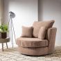 A grey tub chair you will fall in love with, and probably claim as yours and yours only. Also available in brown. Upholstery fabric is a soft structured cord chenille fabric that feels luxuriously soft, while looking charming and unassuming. A generously filled fibre back cushion complements a couple of toss cushions and a deep filled foam block seat. The arm rest circles back to help you relax your shoulder as well. A lounge chair that shall serve you for years to come!