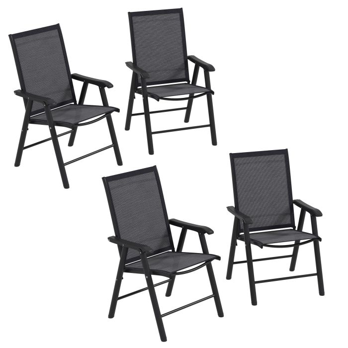 Never be stuck for a seat again, whether you're home or away, with this set of four folding chairs. Using metal with a powder coating for extra strength and durability, the frame is crafted into a classic outdoor chair style for simplicity, with texteline seats that allow your skin to breathe - perfect for the hotter days. With a tall, slightly tilted back, wide seat and mid-rise armrests, each seat will support you whilst keeping you comfortable for long periods of time.