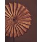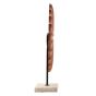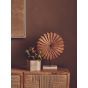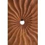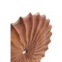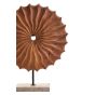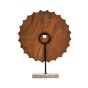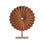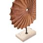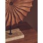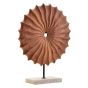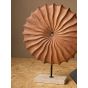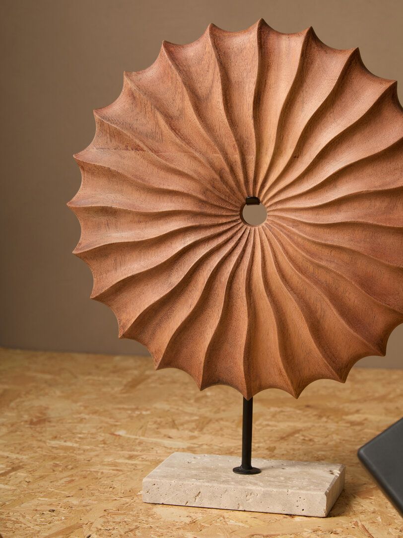The JORMERE round sculpture showcases a radiating, segmented design meticulously carved from natural wood and stands on a travertine base.
