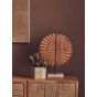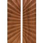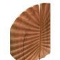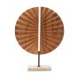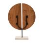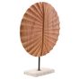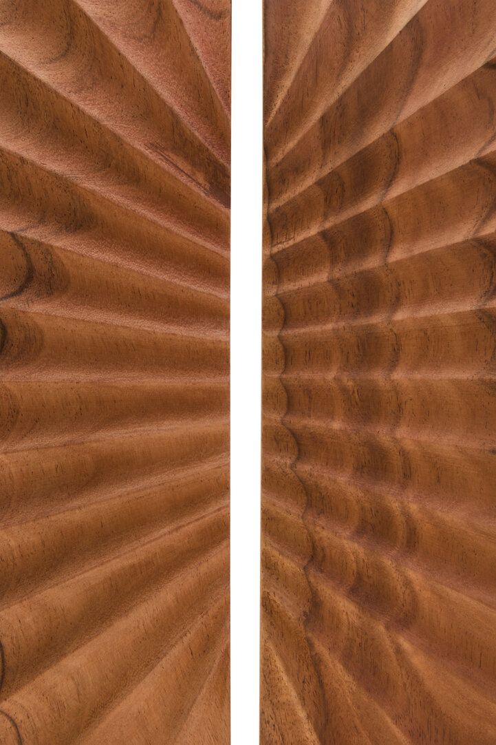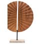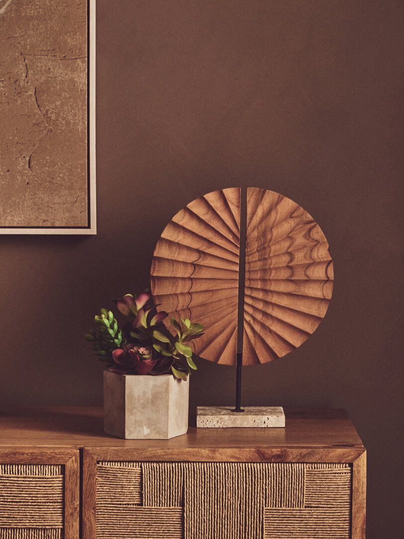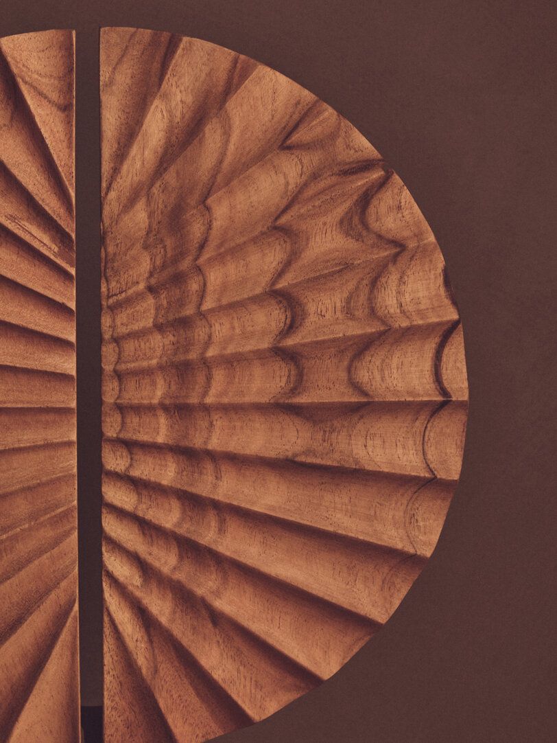 The JORMERE sculpture, carved from natural wood, features a radiating, segmented design that emerges from a central split and stands on a contrasting travertine base.