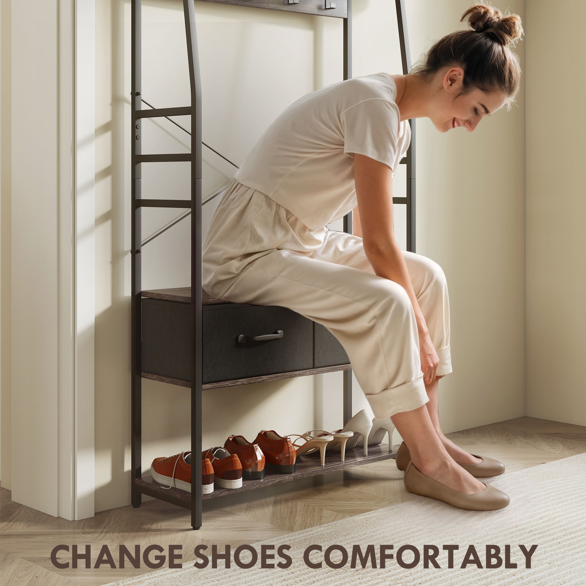 Tired of morning entryway chaos? The frantic search for coats and shoes can be stressful, especially with a busy family. This HOMCOM hall tree provides a calm solution. Its solid frame offers peace of mind, while the integrated coat rack and shoe storage create a dedicated spot for everything. With ten removable hooks for customization, you can finally transform that cluttered corner into an organised, welcoming space for a smoother start to your day. Multi-feature design: Hallway organiser combines a hanging rail, shoe bench, shoe rack, top shelf, fabric drawers and coat hooks. A place to keep outwear, footwear, small essentials and other accessories 10 removable hooks: Place and rearrange where you need - the setup is in your hands. Hang coats, bags, hats, scarves - and much more - where you like Metal frame: A strong core, which supports your items in place. 'X' bar for extra support. Adjustable foot pads gently protect the floor. Anti-tipping straps included to safely secure structure to a wall Industrial-style design: Distinctive brown wood-effect panels, paired with the matte black metal frame - hall tree is a stylish and striking addition to your home