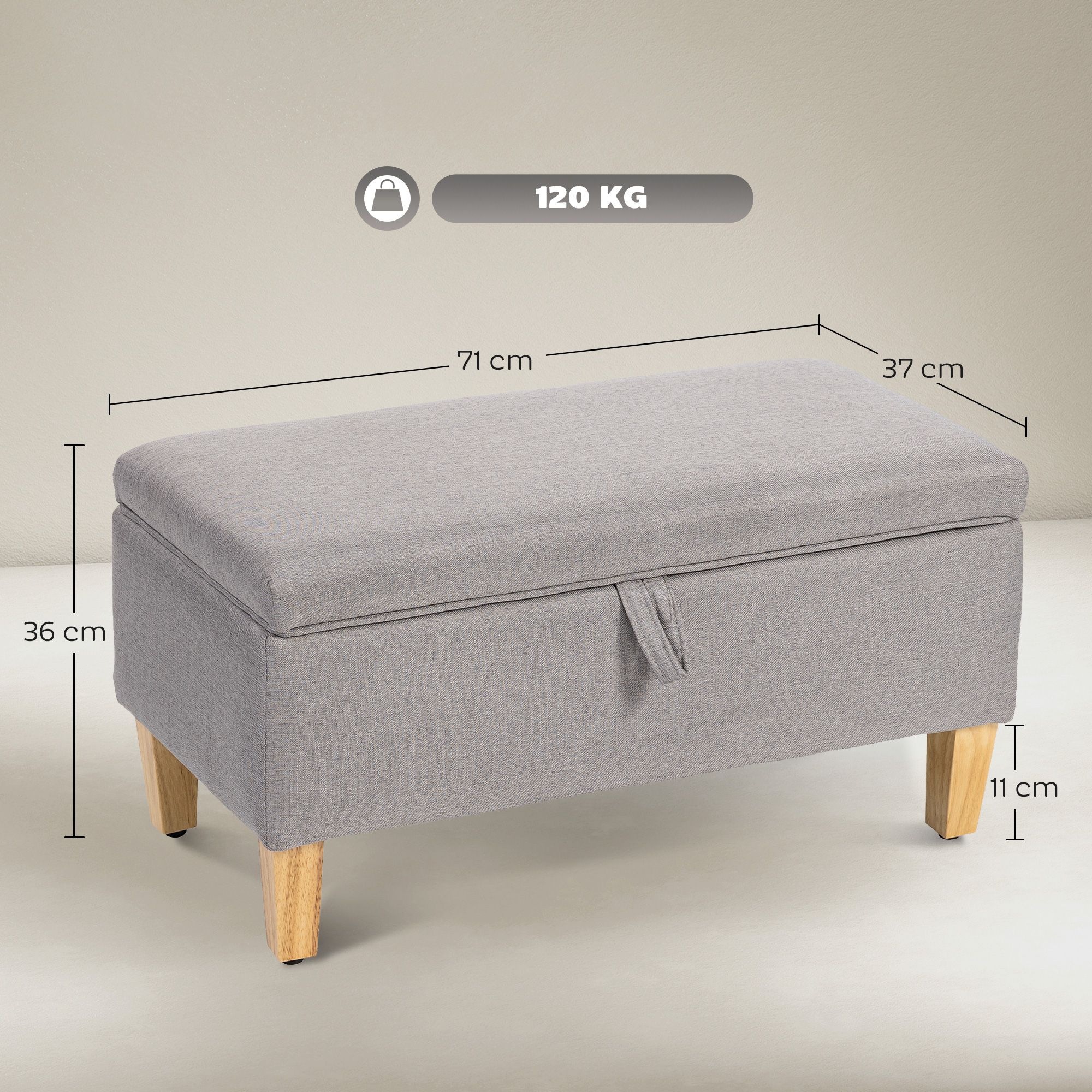 Keep the home space tidy easily - this ottoman bench from HOMCOM. Using wood for the frame to handle up to 120kg, the lid is filled with foam for comfort when sitting. There is lots of room inside for storage, so you'll keep the area discreetly tidy. It is finished with four solid wood feet for balance. Inner: Storage for keeping your area tidy. Discreet so your home/office looks very organised. Suitable for living rooms, bedrooms, hallways and study rooms. Padded top: Thick sponge filling for comfort. Linen-look upholstery is smooth on the skin. Wooden frame: A strong and stable structure. Four tapered legs for support. Non-slip foot pads to protect floor. Neutral light grey upholstery: Blends in easily with your bedroom and living decor. A versatile piece.