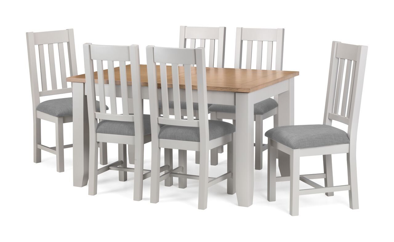 An elegant extending Dining Table, presented in an immaculate painted, soft Elephant Grey finish with beautiful pale oak top, crafted from a combination of high grade American White Oak solids and veneers. This imposing dining table features a substantial 35mm top and a 40cm butterfly extension system that is easy to use and stores within the table when not in use.The combination of superior quality materials and classic design ensures a timeless appeal and fits perfectly alongside both traditional and contemporary decor. Part of the extensive Richmond Dining and Occasional furniture range.