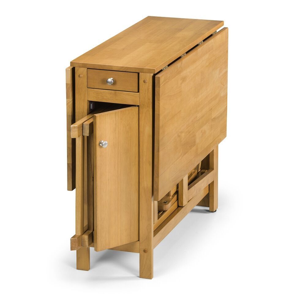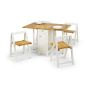 A Neat and Functional, Space Saving Dining Set where the Chairs can be Folded and Stored Inside the Table, Available in a White and Natural Finish and an All Over Light Oak Finish.