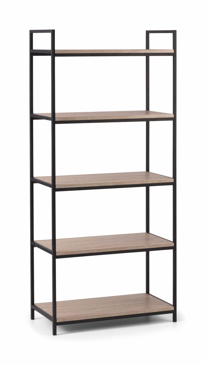 A cool, modern tall bookcase designed to add a contemporary touch to any home or work place. Its simple clean lines, delineated by a subtle, black coated metal frame are complemented perfectly by a warm, sonoma oak foil, to create a very stylish and sleek product.