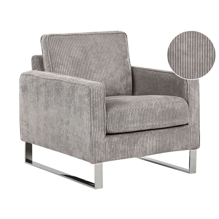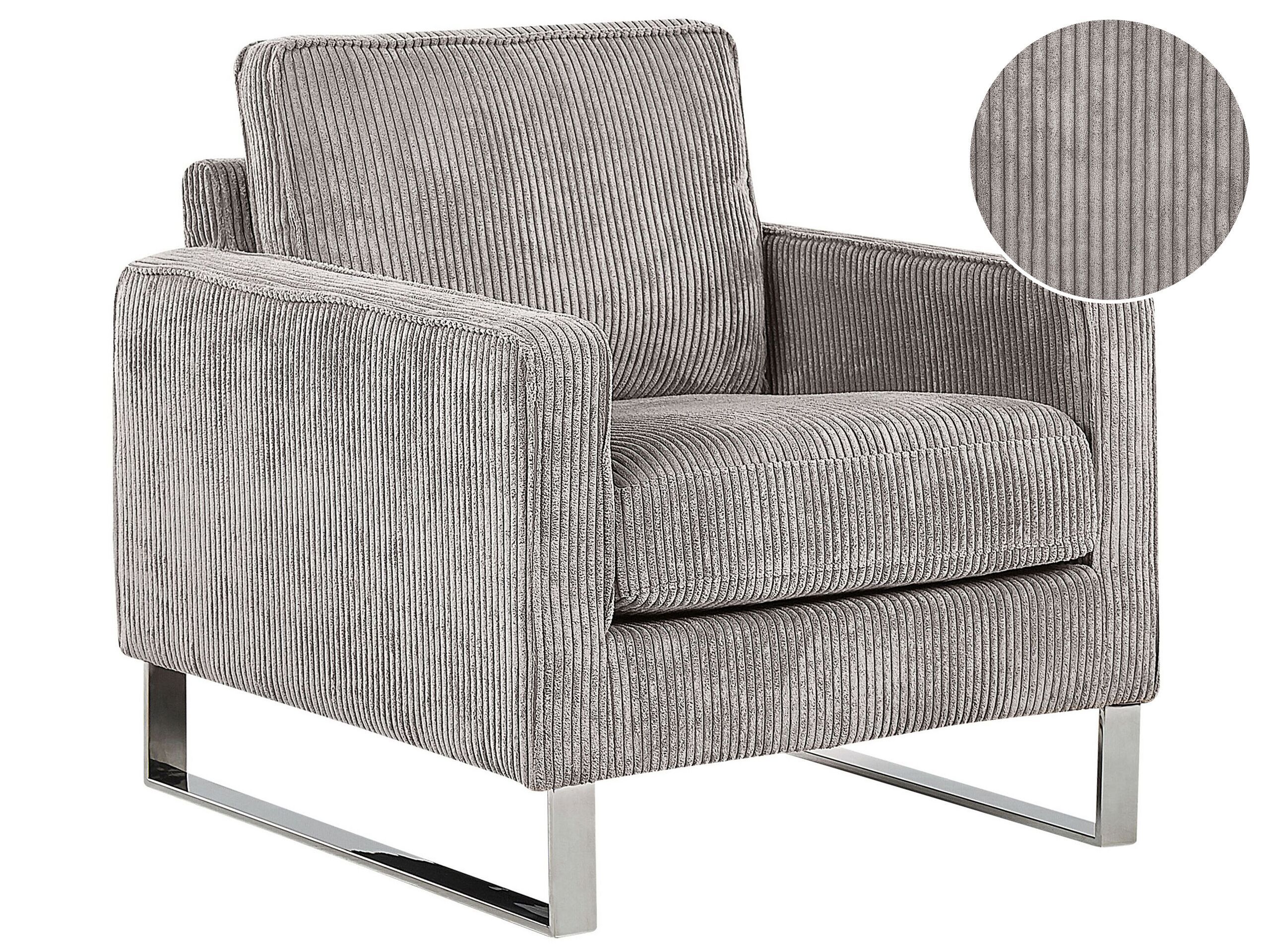 This armchair features a robust frame, standing stable on the stainless steel legs. Thanks to the corduroy upholstery, the chair looks unique and is a fine addition to the retro-inspired interiors. Granted its neat design, the armchair makes a perfect fit for every living room, bedroom as it will ensure comfortable seating for you and your guests. Details: Color: Grey. Main material: Corduroy. Additional material: Stainless Steel. Material Composition: 75% Polyester, 25% Cotton Weight: 23 Assembly: Partial Assembly Required Weight Capacity: 200 Padding Thickness: 11 Seat Height: 44