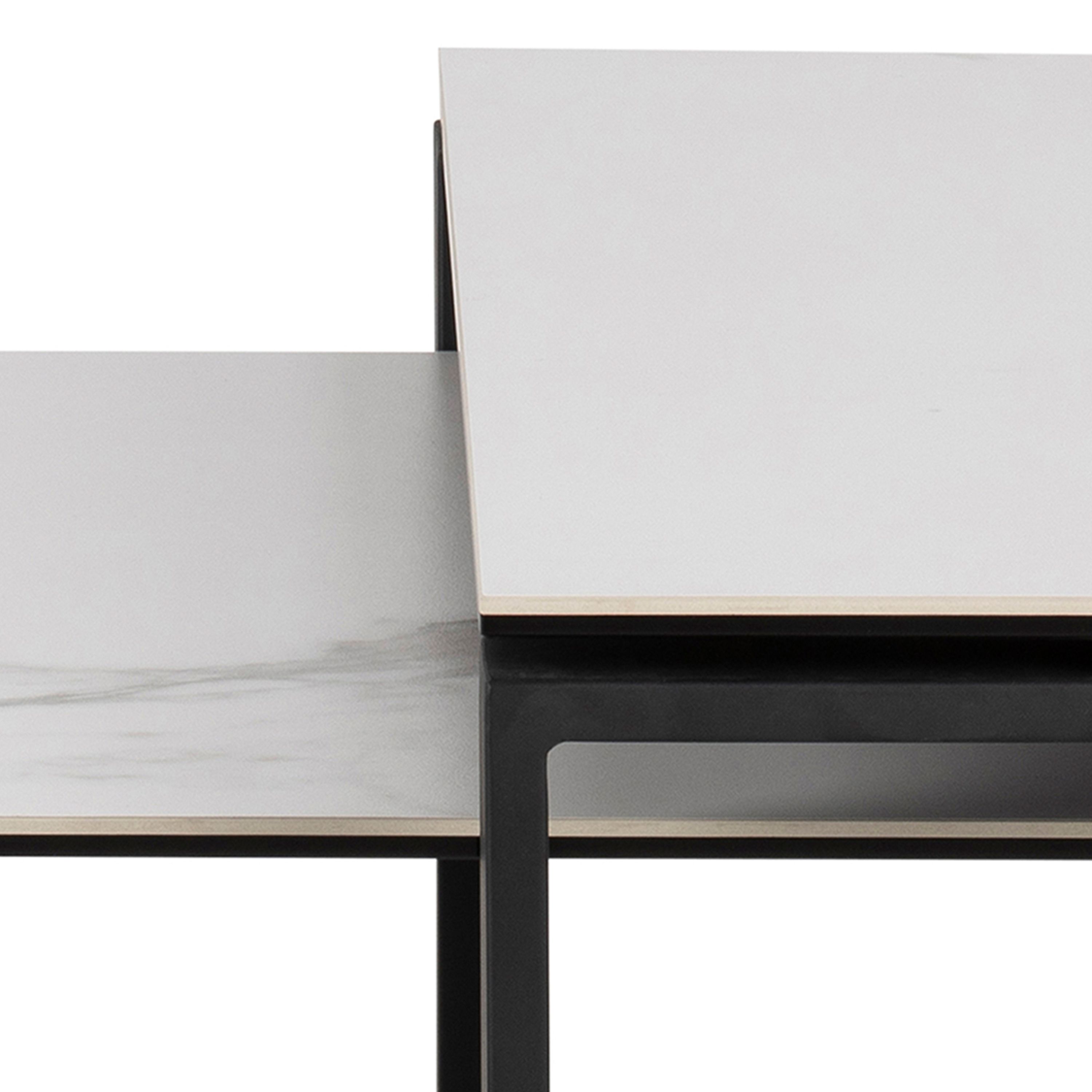 Add a touch of modern elegance to your living space with our coffee table set, featuring a pristine white rough ceramic top. The set is supported by a matte black rough powder-coated steel sledge base, ensuring both style and stability. This duo is perfect for creating a cohesive and contemporary look.