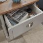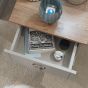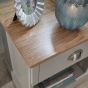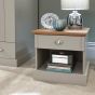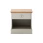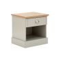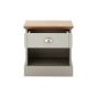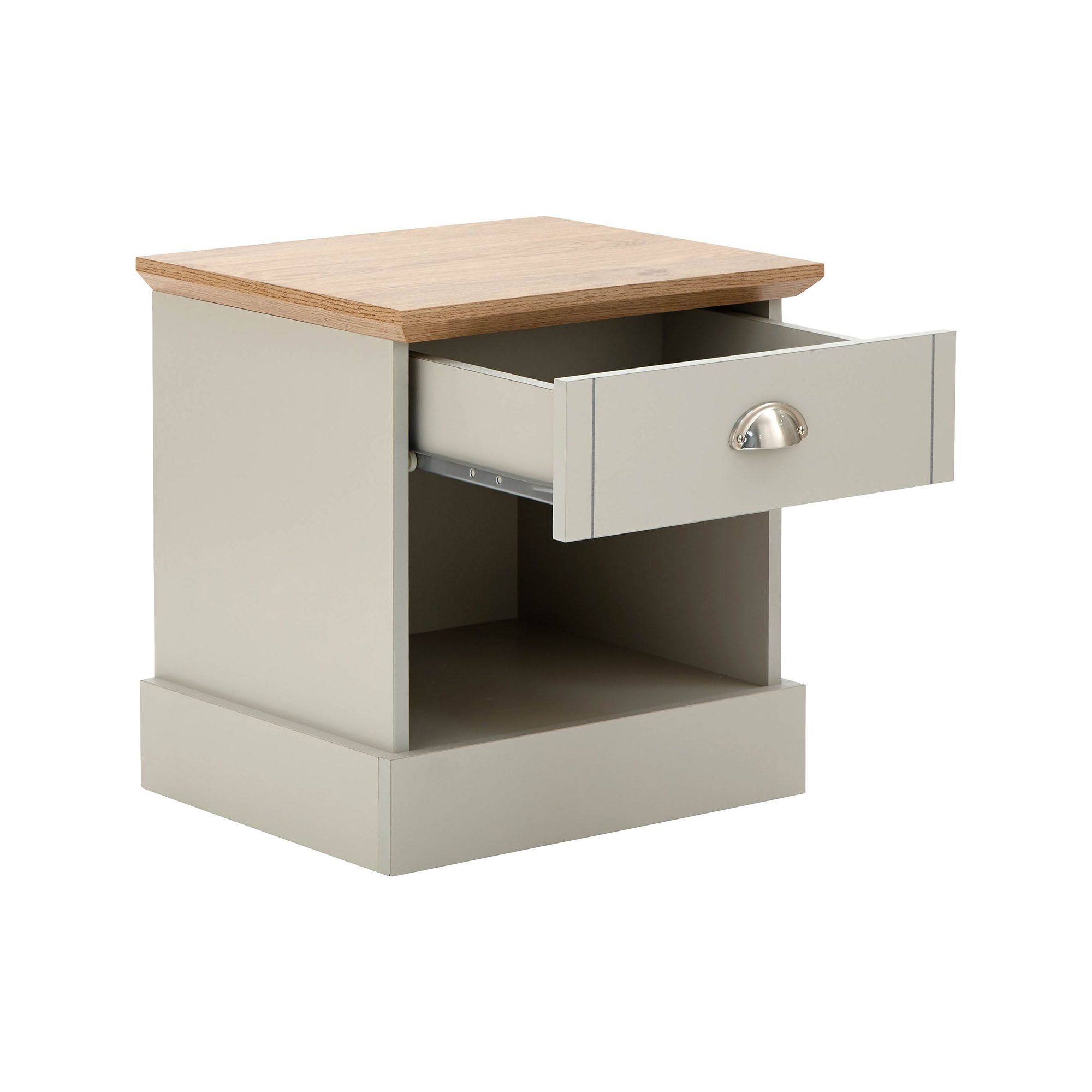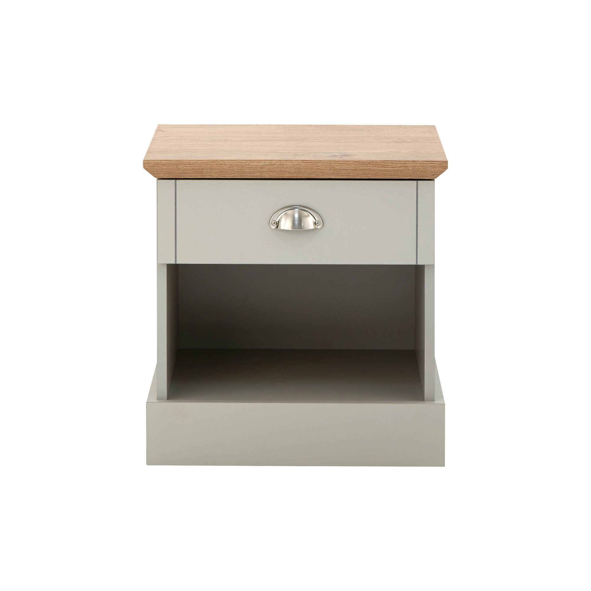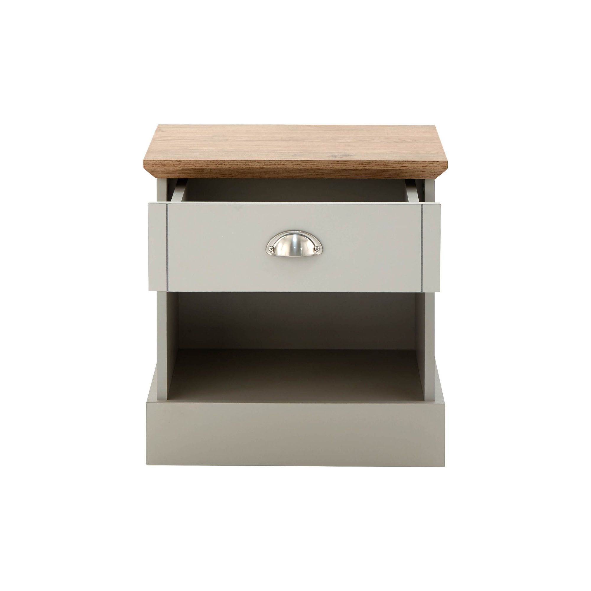 Upgrade your bedroom furniture with classy Kendal. This smart bedside table will suit any classic or contemporary interior scheme, uniting a soft grey painted base with a bevelled oak-effect top to stylish effect. The unit incorporates a neat top drawer, complete with brushed steel cup handle and features an open shelf that makes a great repository for books and other nightstand essentials.