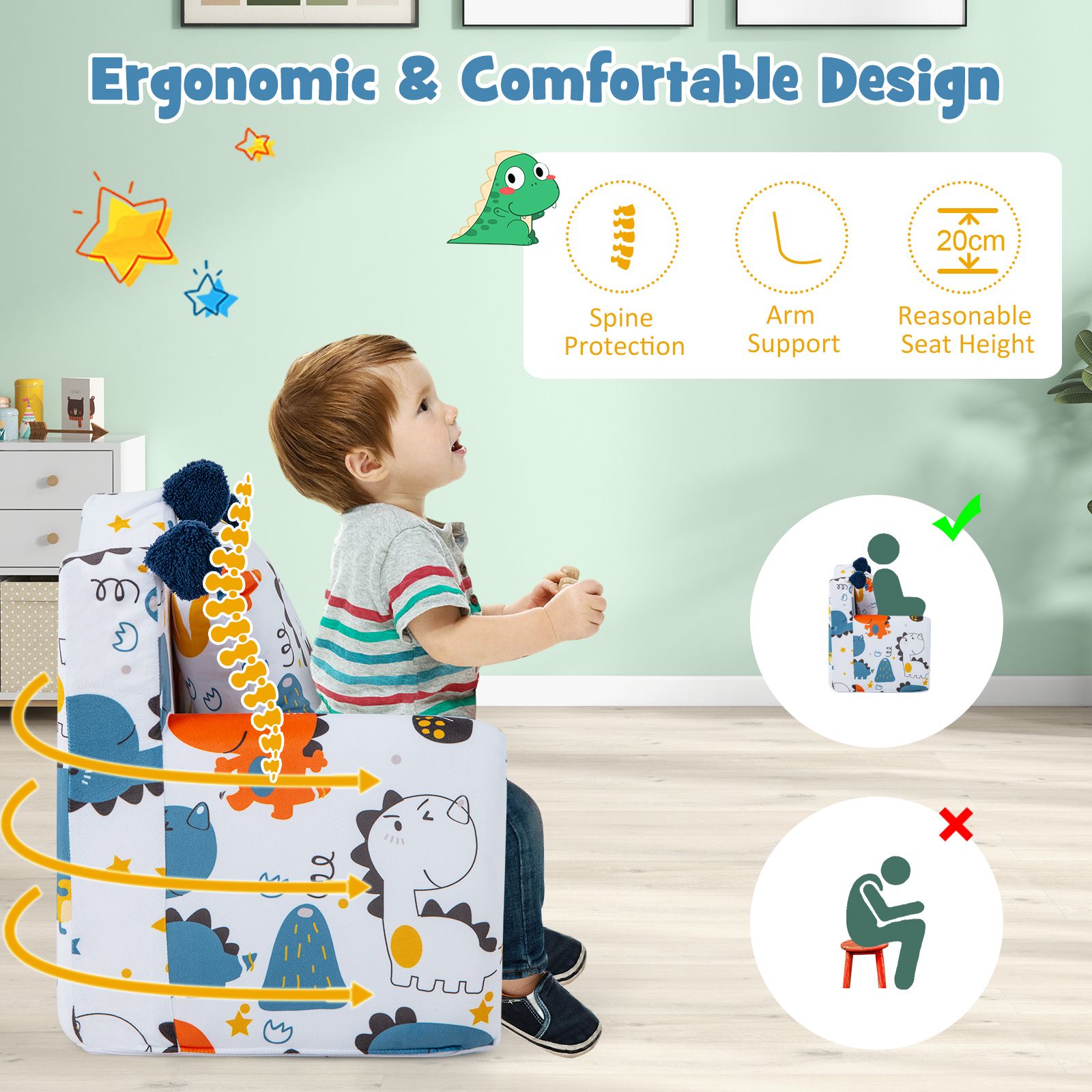 Let your little one enjoy leisure time with our comfortable kids sofa!!! Top fur balls, crown-shaped design and dinosaur/ strawberry/ leaf patterns will attract kids’ attention. The adorable armchair has ultra-soft velvet cover and sponge filling to ensure kid’s sitting comfort. With ergonomic backrest and armrests, the toddler sofa is . And it also comes with a pillow to add more comfort. Plus, weighing only 3kg, the sofa is super easy to move. After use, parents can easily detach the machine-washable cover with zippers for easy cleaning. And it’s suitable for under 5 years old kids to use. Ergonomic Kids Sofa Chair: This ergonomic kids sofa is equipped with a wide backrest, a spacious sitting area and comfy armrests. Thus, the chair helps kids to develop a good sitting posture and is great for spine protection, pressure dispersion as well as arm support. Comfortable and Safe Design: The toddler armchair with a pillow is covered with ultra-soft velvet, which is skin-friendly, breathable and comfortable. Meanwhile, filled with high elastic sponge, the sofa is supportive enough to offer great support for your baby. In addition, the kids sofa doesn’t have any sharp corners. Machine-Washable Cover: Designed with smooth zippers, the super-soft velvet fabric cover of the sofa and pillow can be effortlessly removed for cleaning. You can machine wash the cover and the sofa couch will stay the same as the new one after washing, saving your time and energy. Lovely Furniture for Kids: This kids sofa features fur ball decoration, crown-shaped design and dinosaur/ strawberry/ leaf patterns to appeal to your little one under 5 years old. With 20cm reasonable seat height, your child can easily get up and down. They will fall in love with sitting on this armchair to read, watch, play or rest. Light Weight and No Assembly: The toddler sofa weighs only 3 kg, allowing kids to easily move it to different places, such as the kid’s play room, bedroom or nursery. Additionally, our sofa chair comes assembled.