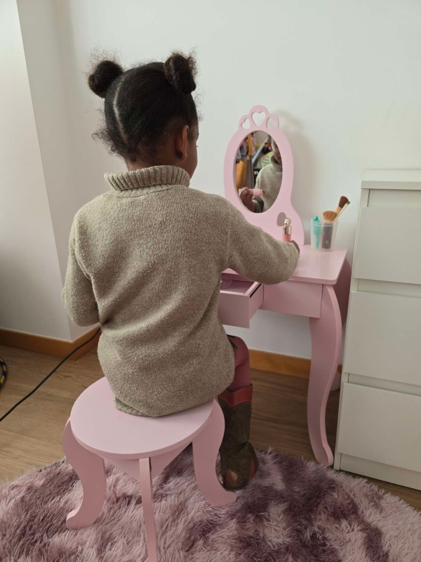 Princess perfect in one set. This dressing table and stool, from, is a noble way for them to get ready day and evening. Pink in colour, it features heart cut-outs on the top and side of the mirror for extra magic. The curved legs of the table and stool create a modern and relaxed look. There's a small drawer for keeping accessories safely stored. The mirror allows your child to get ready - whether just pretend getting ready, or going out to see friends.