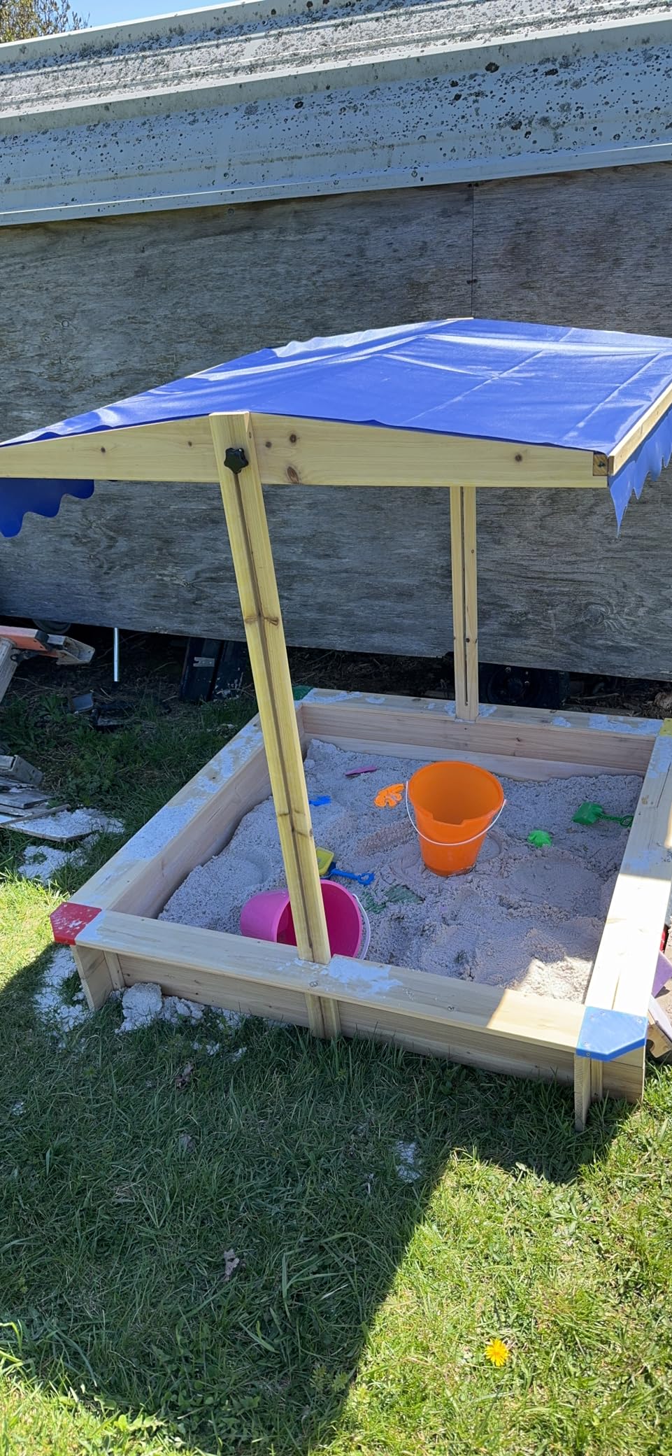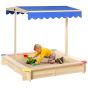 Outdoor play the classic way - choose this sandbox, from, to give kids hours of fun. Made from fir wood, the frame is very durable and is resistant to cracking. Its open square design offers plenty of space for sand and a few kids to play together at once. The top is fitted with a sun canopy for protection - height and angle adjustable for better coverage throughout the day. Let them dig their way to happiness this summer.