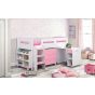 The Kimbo Cabin Bed is available in two colour options, a combination of White and Soft Pink or White and Sky Blue. The Kimbo has been designed with a pull out desk, a 3 drawer chest and shelving unit for books etc. The product also takes a standard UK single mattress (90cm x 190cm).