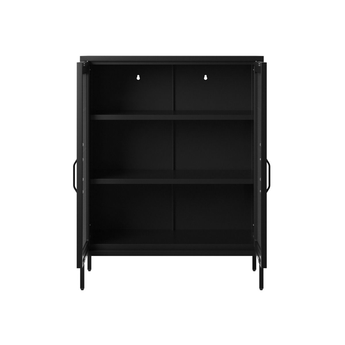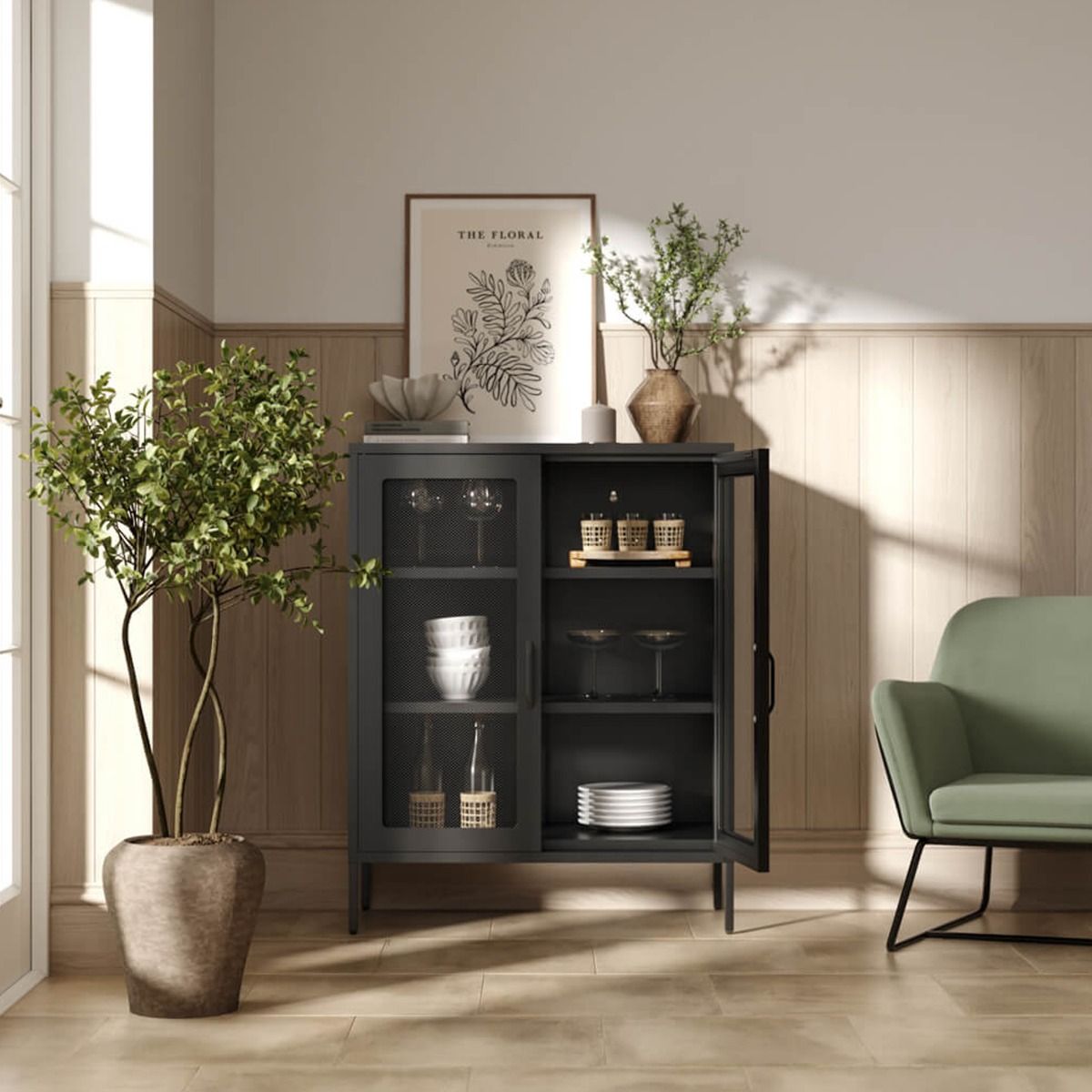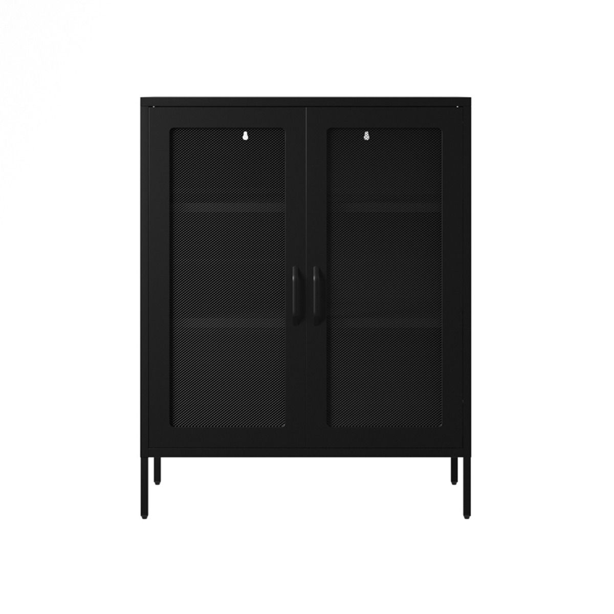 Add a touch of modern style to your living space with the REUB Black Cabinet. Made from steel and mesh, this sleek cabinet features a black matte finish and clean lines, perfect for storing books, decorative items, and more.