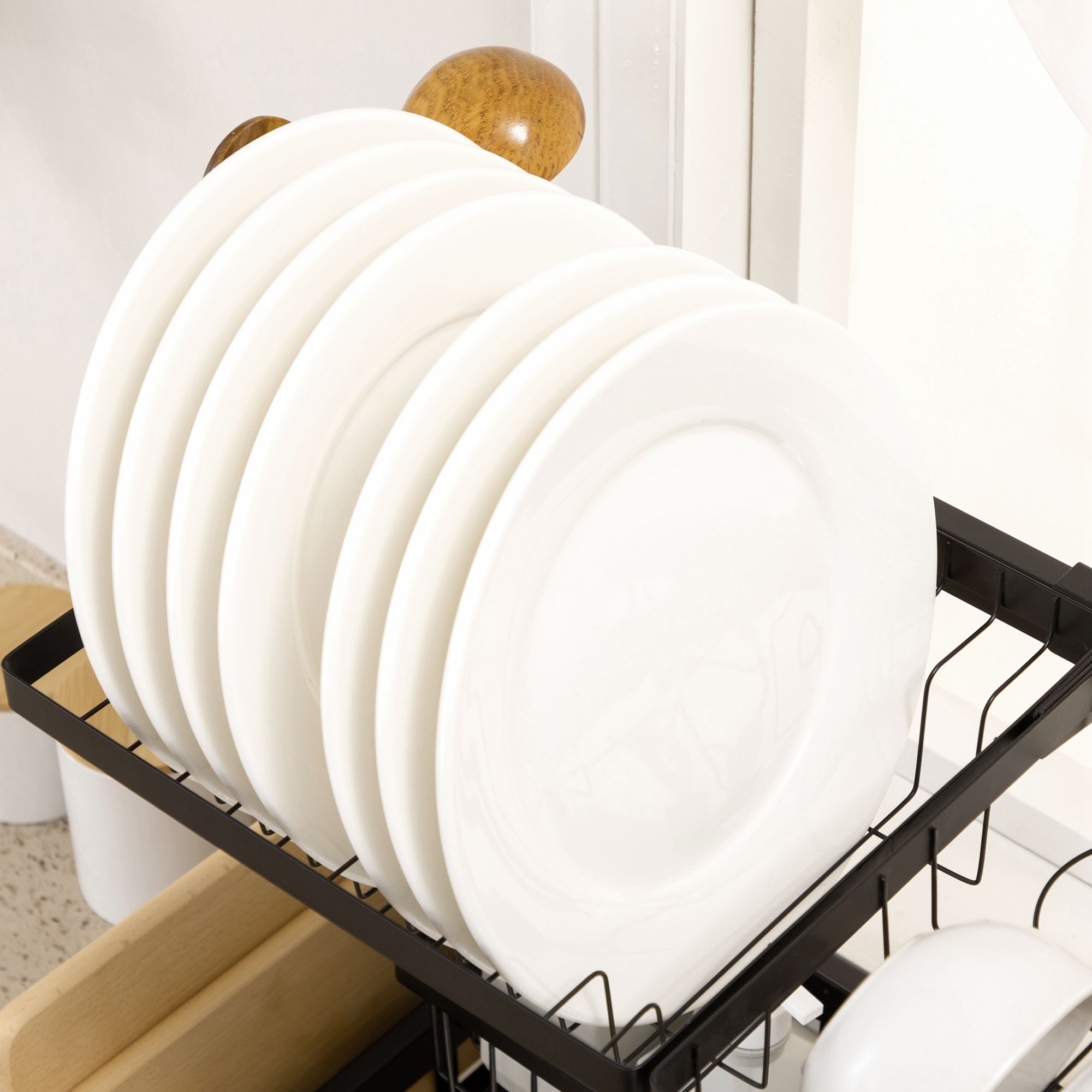 Easy and efficient draining with this PUERTO dish rack. It comes as a modular design - with a bowl rack, a plate rack, two utensil holders, a detergent holder, a knife holder, a cup holder, five hooks and a chopping board holder: simply move each part to where you need. The powder coated steel structure is strong and supportive. Kitchen drainer rack is complete with non-slip feet for grip.