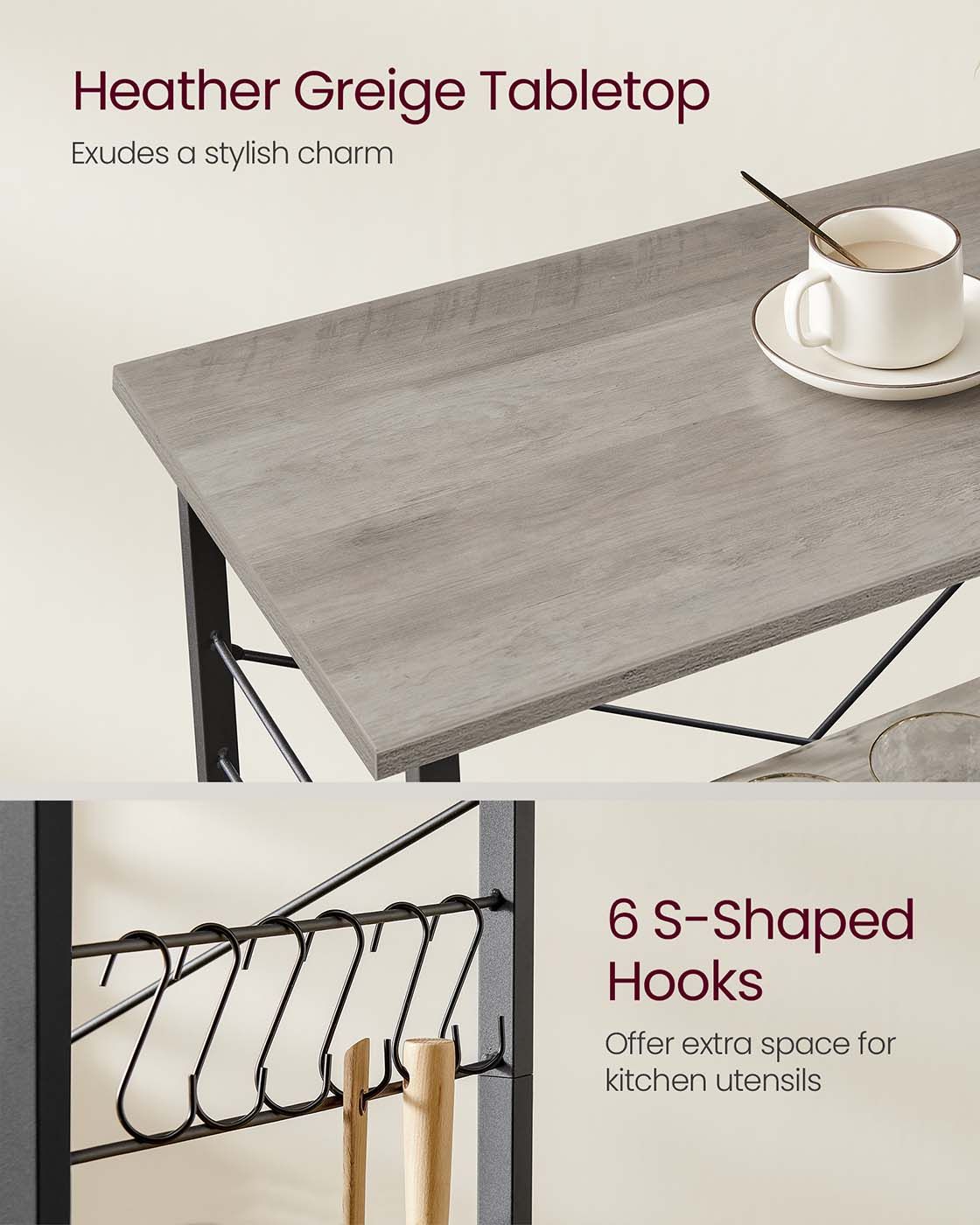 Kitchen Shelf - SOLRA 3-Tier Rolling Storage Shelf with Wheels - Heather Greige and Black