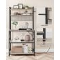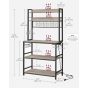 Organize your kitchen with this stylish VASAGLE storage rack. Measuring 80 cm wide, it features a power outlet and a rustic brown and ink black finish. Perfect as a coffee bar or baker's rack, it includes a metal wire panel and 14 hooks to hold microwaves and other kitchen essentials. The sturdy steel frame ensures durability for everyday use.