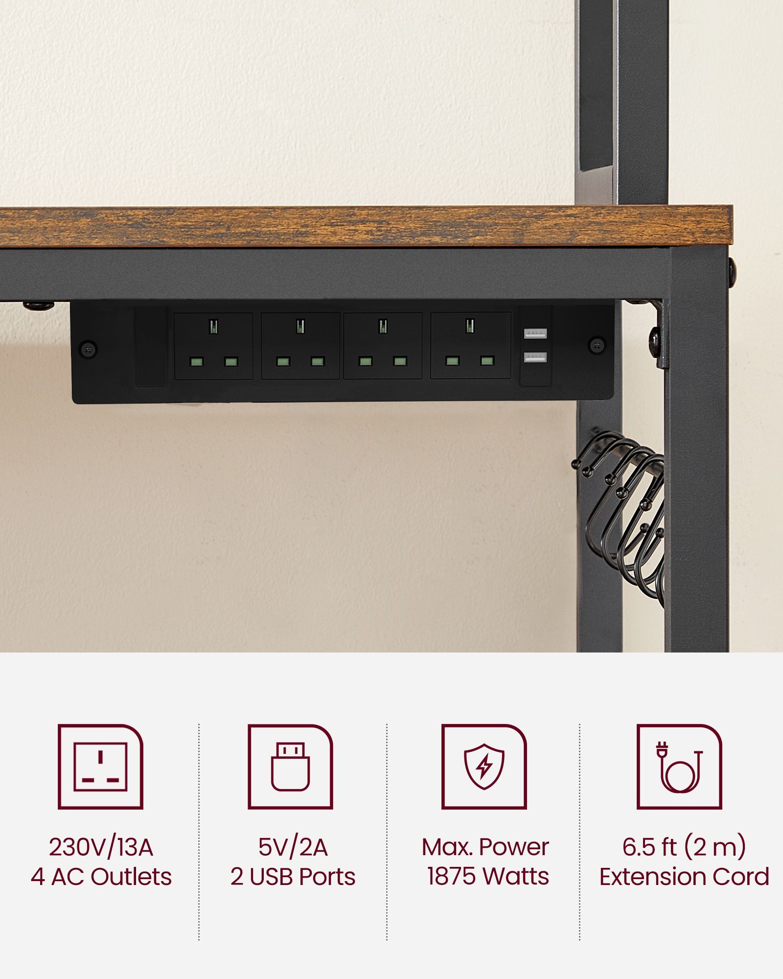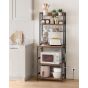 Organize your kitchen with the VASAGLE Kitchen Storage Rack. This versatile baker's rack, featuring a built-in power outlet, is perfect for your microwave and coffee bar essentials. Its sturdy steel frame in rustic brown and ink black, along with a metal wire panel and 14 hooks, offers ample storage and easy access. Dimensions: 40 x 80 x 170 cm.
