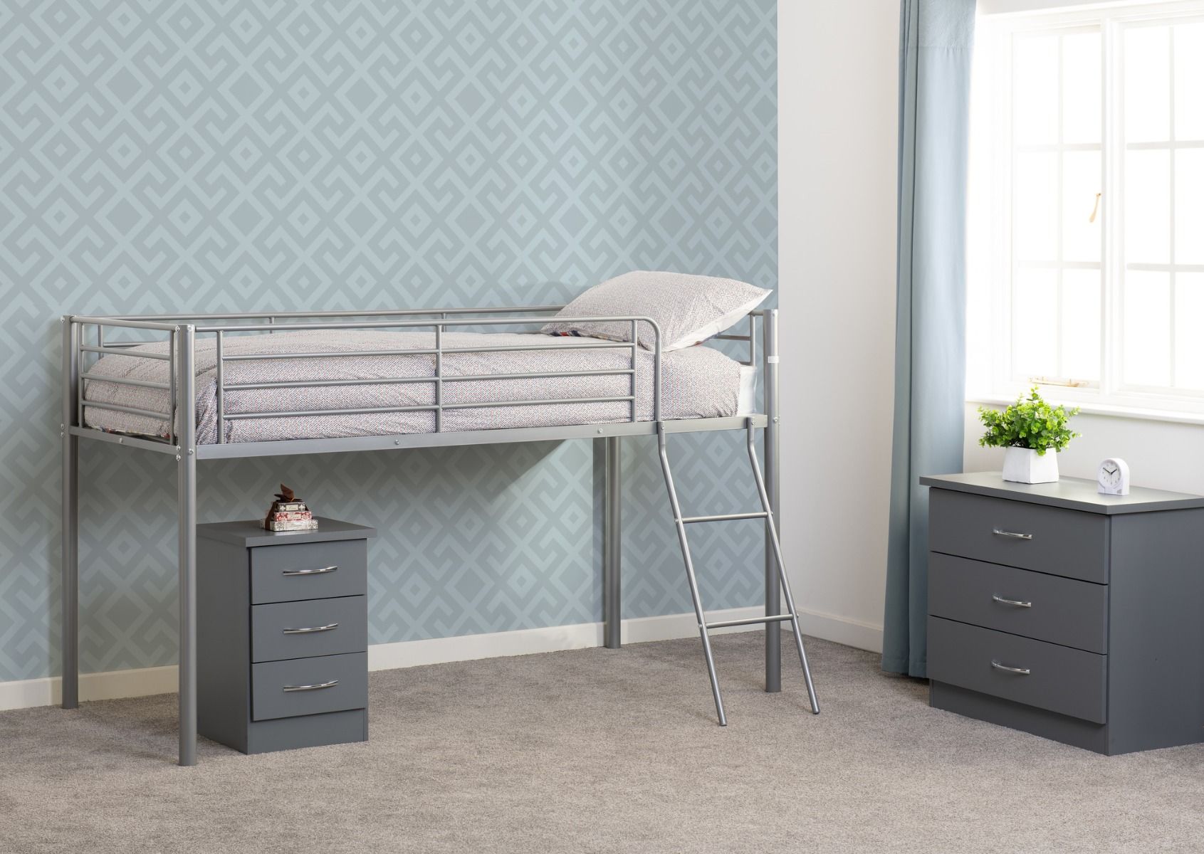 The Kora Mid Sleeper in Silver finish offers a modern and sturdy metal frame bed solution. With a robust construction and comfortable design, it provides a cozy sleeping space. The silver finish adds a touch of sleekness to any bedroom. Home Done Furniture offers a large stock of this range, ensuring timely delivery and installation.