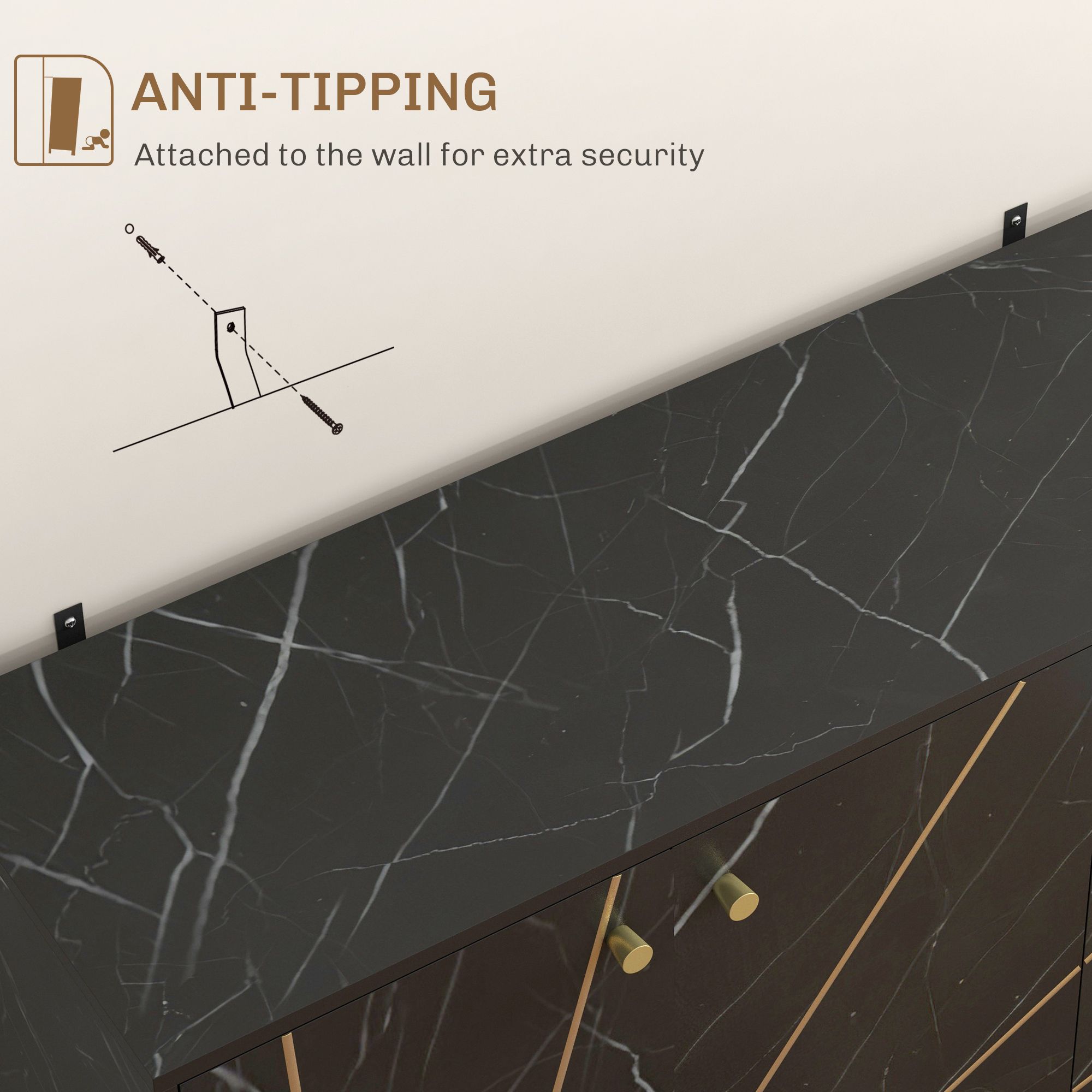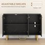 Elevate your space with the HOMCOM kitchen storage cabinet, where modern luxury meets functionality. Adorned with a chic marble texture and glamorous gold-tone legs and handles, this sideboard combines style with practicality. It features spacious cabinets, including a large double-door and a smaller single-door, each housing a 3-level adjustable shelf to cater to your storage needs. Add a touch of sophistication to any room! Modern luxury design: Elevate your living space with this sideboard, featuring a sleek marble texture and sophisticated gold tone legs and handle for a touch of elegance. Spacious storage options: This living room sideboard includes a large double-door cupboard and a smaller single-door cupboard, suitable for organising various household items discreetly and stylishly. Adjustable shelving: Each cupboard in this sideboard features 3-level adjustable shelves, allowing you to customise the storage space to suit your needs. Reinforced structure: This kitchen sideboard is built with reliable metal legs and protective foot pads for enhanced stability and floor safety. Anti-tip kits add extra security, while the particleboard construction ensures long-lasting durability.