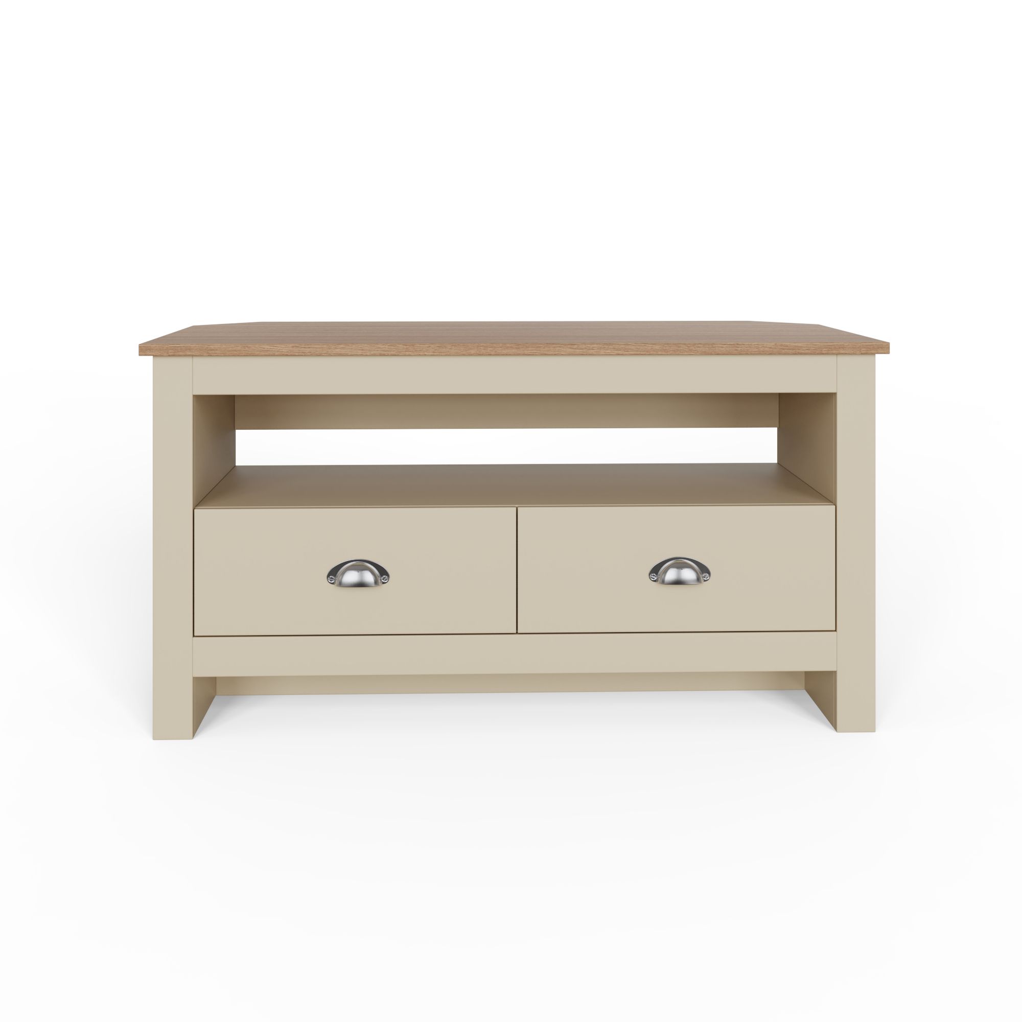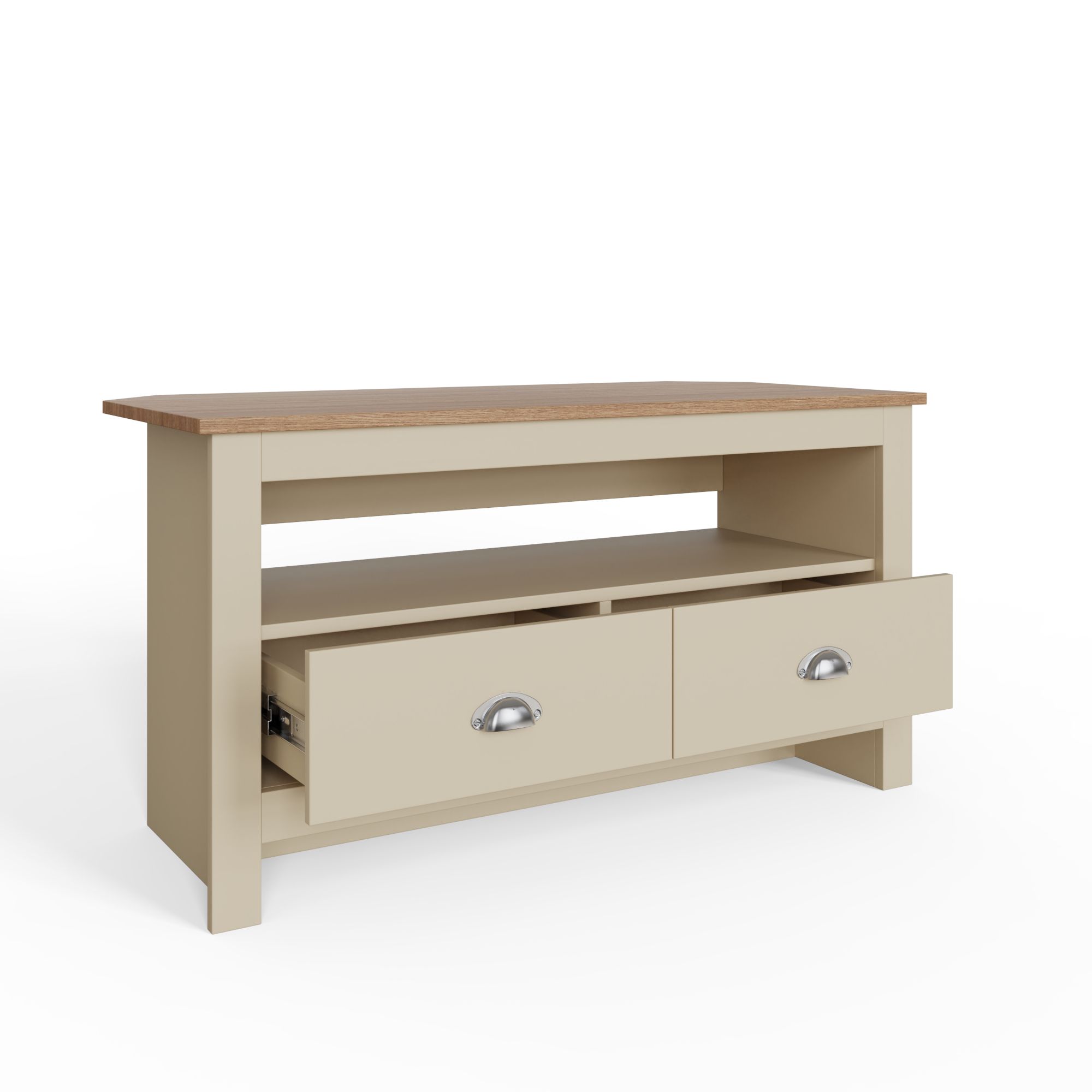 This Lancaster Corner TV unit features a large shelf for all of your entertainment systems and 2 large storage drawers. Like the rest of the Lancaster range it is available in a modern soft grey or cream finish with contrasting oak veneer top, the two handy drawers on are fitted with satin silver drawer pulls.