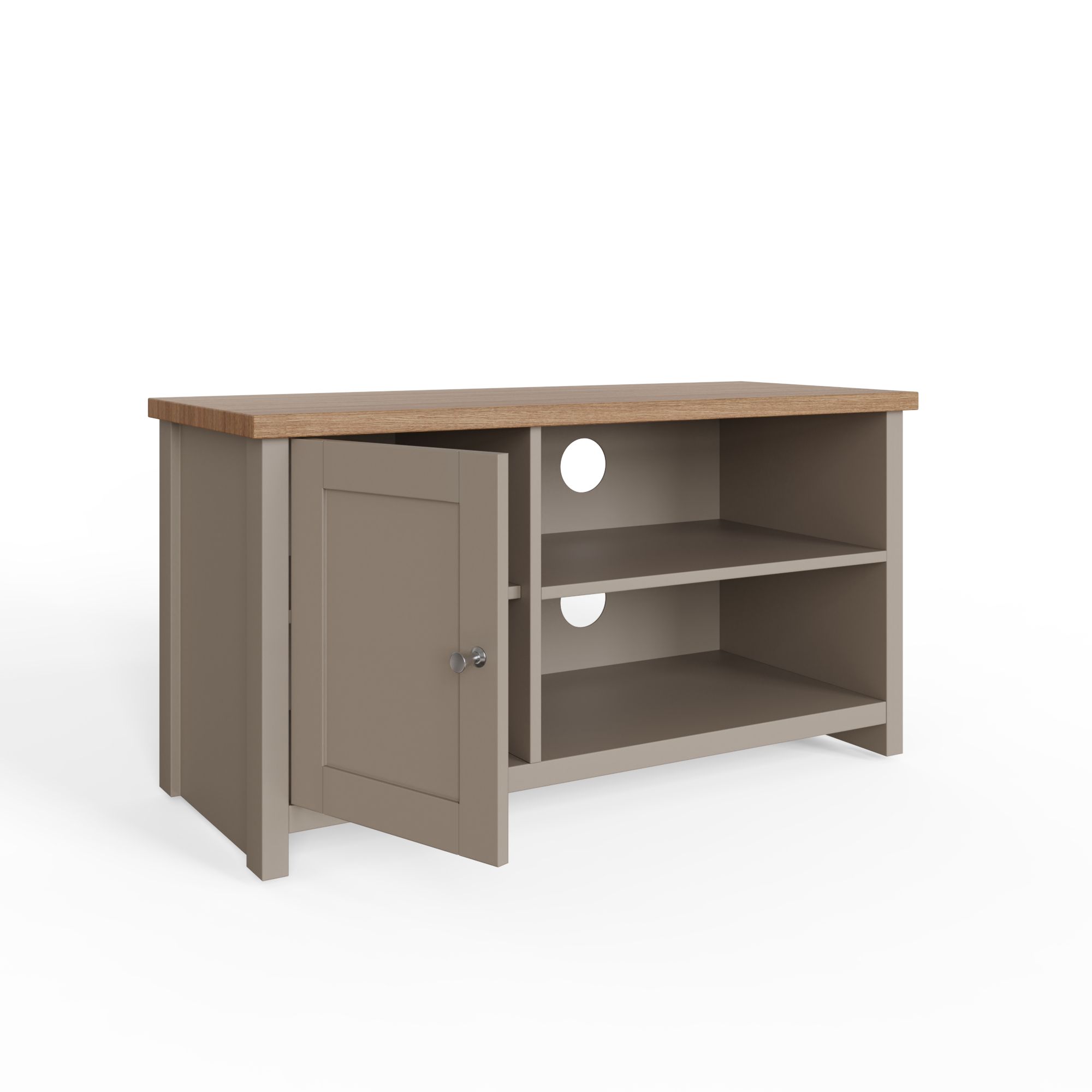 It may be the smallest TV cabinet in the Lancaster range but its not short of features. A double shelf with rear cable entry and plenty of space for DVDTV boxes plus a single cupboard to provide storage for manuals, remotes or DVDs make this a very practical piece of furniture. Designed with clean edges and available in a modern soft grey finish with contrasting oak veneer top as the Lancaster Small TV cabinet would work well in any living room both contemporary or traditional.