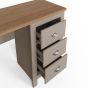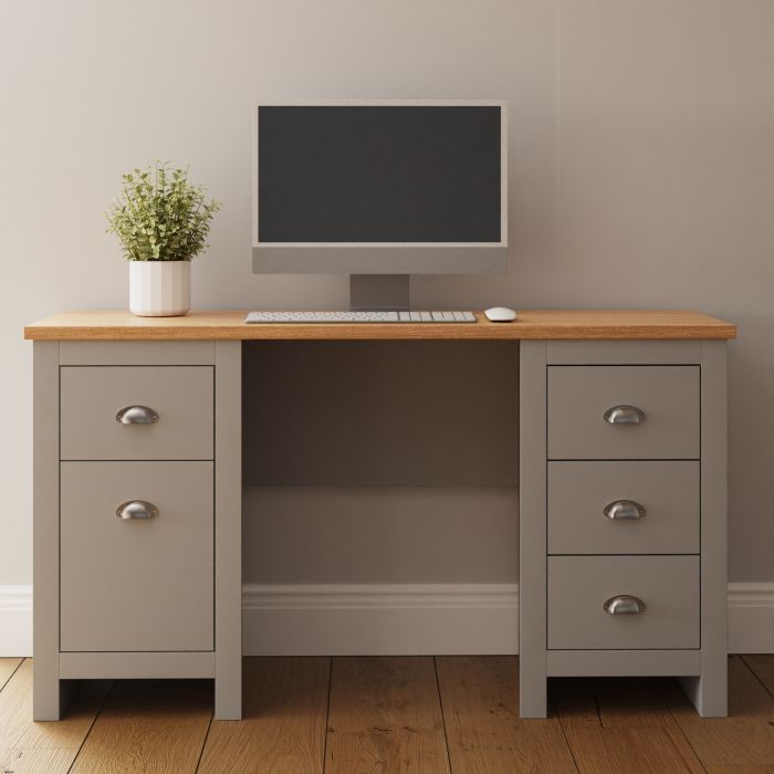 The Lancaster Study Desk features a convenient cupboard and 4 large storage drawers in addition to a useful working area. It is available in a modern soft grey or cream finish with contrasting oak effect top, the drawers and cupboard on are fitted with signature Lancaster satin silver drawer pulls.